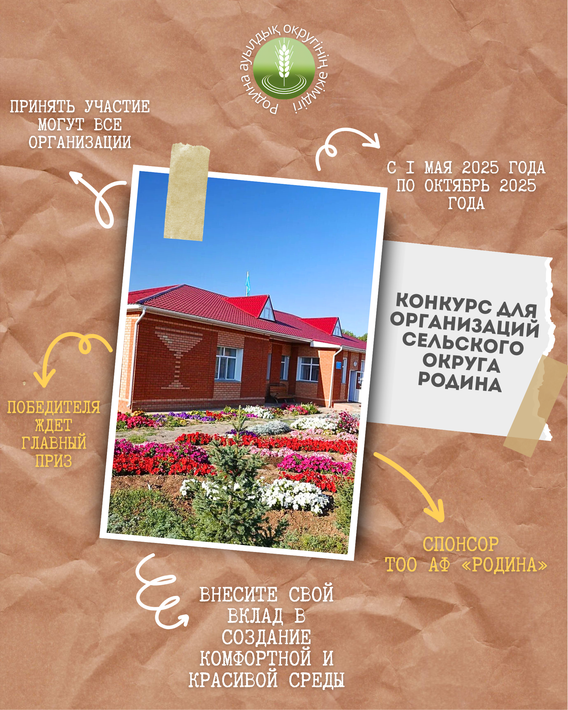Құрметті Родина ауылдық округі ұйымдары мен мекемелерінің басшылары мен қызметкерлері, «Родина ауылдық округі ұйымының, мекемесінің үздік аумағы» атағына абаттандыру бойынша конкурстың басталғанын хабарлаймыз.