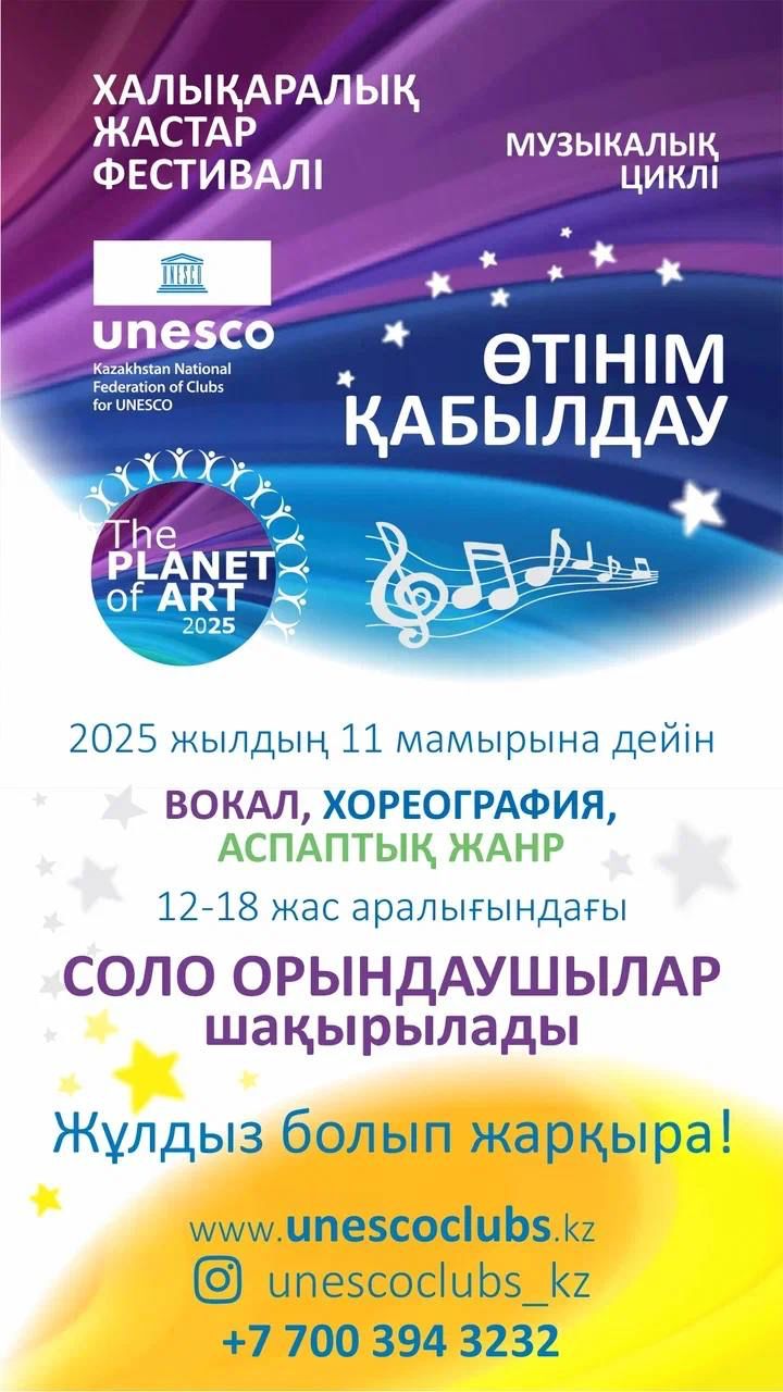 Қазақстандық Ұлттық ЮНЕСКО клубтарының Федерациясы THE PLANET OF ART – 2025 Халықаралық жастар фестивалінің музыкалық циклінің басталғанын хабарлайды.