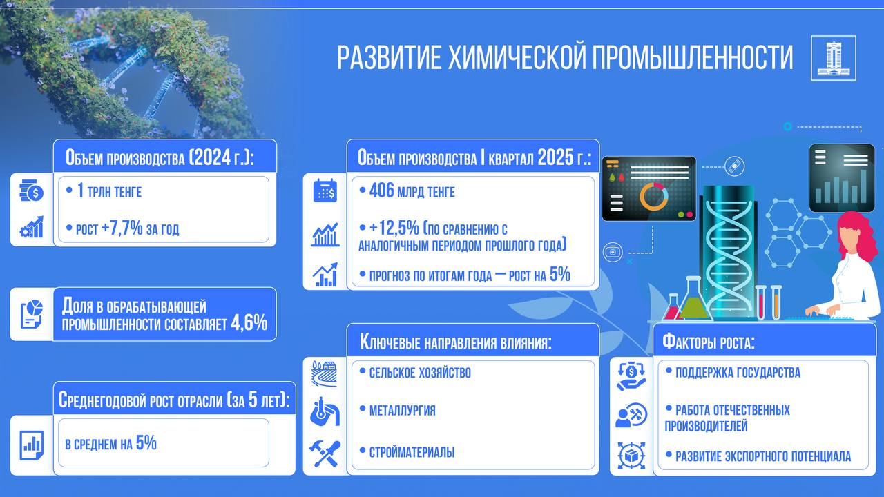Өнеркәсіп және құрылыс министрі Ерсайын Нағаспаевтың айтуынша, бүгінде химия өнеркәсібінің өңдеу өнеркәсібі құрылымындағы үлесі 4,6%-ды құрайды және ауыл шаруашылығы, металлургия, құрылыс материалдары өндірісі сияқты салалардың дамуына оң әсер етеді.