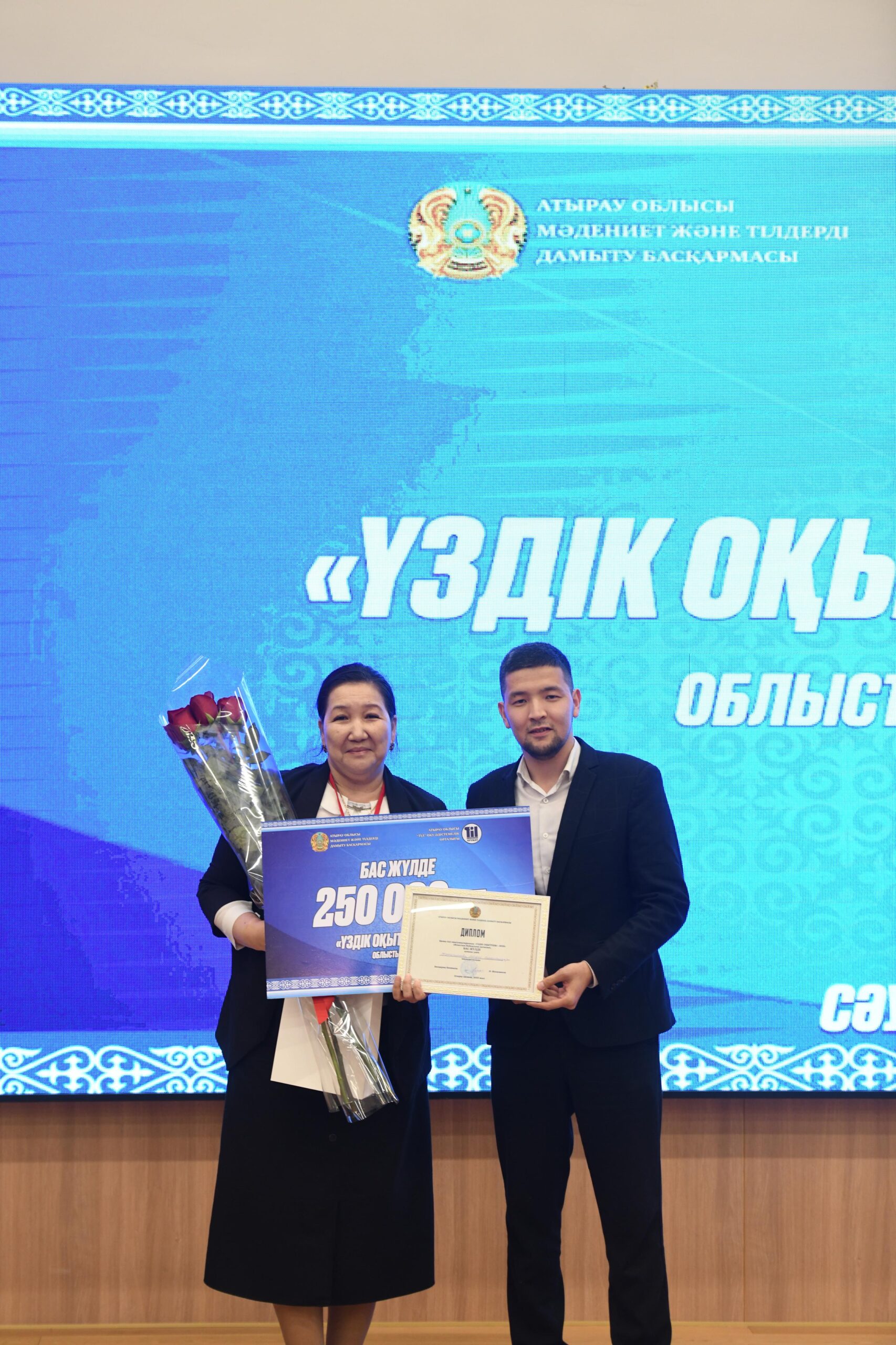 Бас жүлдені Атырау Каспий өңірінің көпсалалы жоғары колледжі мен “Тіл” оқу-әдістемелік орталығының қазақ тілі оқытушысы Жумагалиева Айгүл иеленсе, жүлделі І,ІІ,ІІ орындарды “Тіл” оқу-әдістемелік орталығының оқытушысы Жаңабай Мөлдір, О.Көшеков атындағы аграрлы-техникалық колледжінің оқытушысы Халелова Қарлығаш және Атырау жоғары медициналық колледжінің оқытушысы Утяшова Алмара бөлісті.