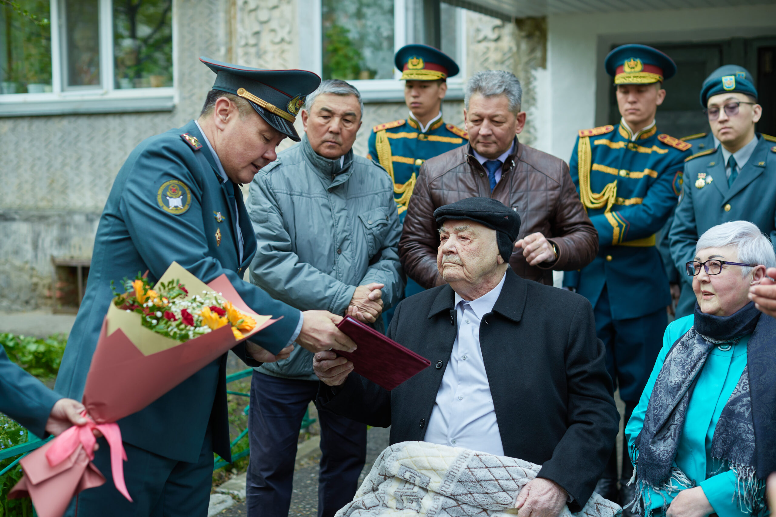 98 жастағы майдангердің үйінің алдында есептік топ саптық шерумен жүріп өтті. Оларды әскери оркестр сүйемелдеді. Майданда танкист болған қария жастарға соғыс жылдарының сұрапыл тұстарын айтып берді.