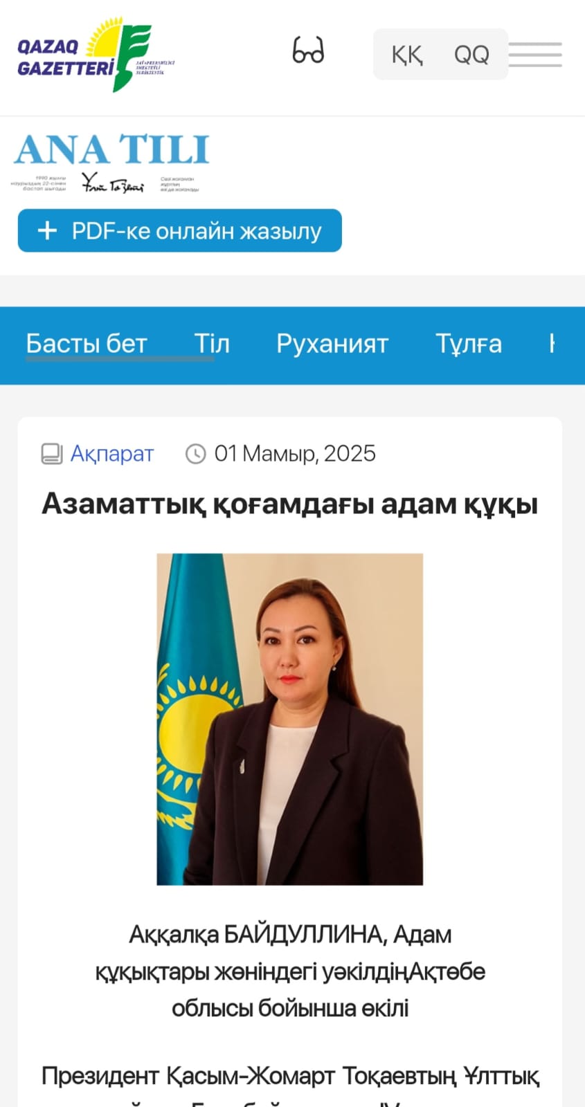 Қазақстан Республикасындағы Адам құқықтары жөніндегі Уәкілдің Ақтөбе облысы бойынша өкілінің «Азаматтық қоғамдағы адам құқы» тақырыбындағы мақаласы республикалық «Ана тілі» газетінде жарияланды.