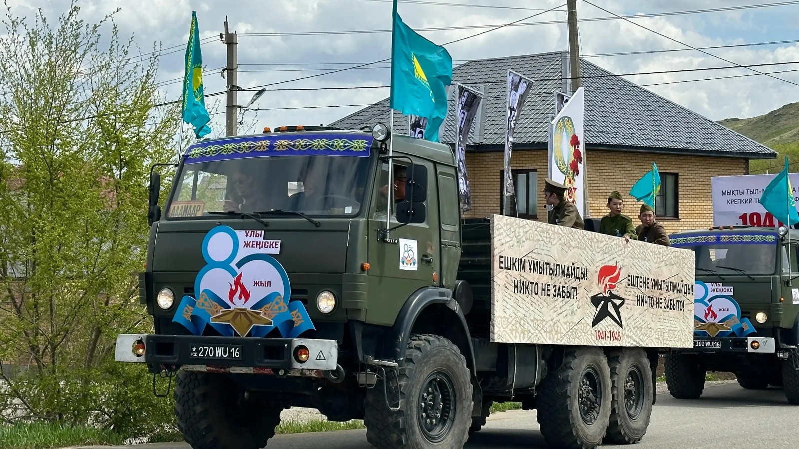 Жылжымалы концерт аясында театрландырылған және музыкалық қойылымдар ұсынылып, соғыс жылдарындағы әндер мен патриоттық шығармалар орындалды, сондай-ақ гүл шоқтарын қою рәсімі өтті.