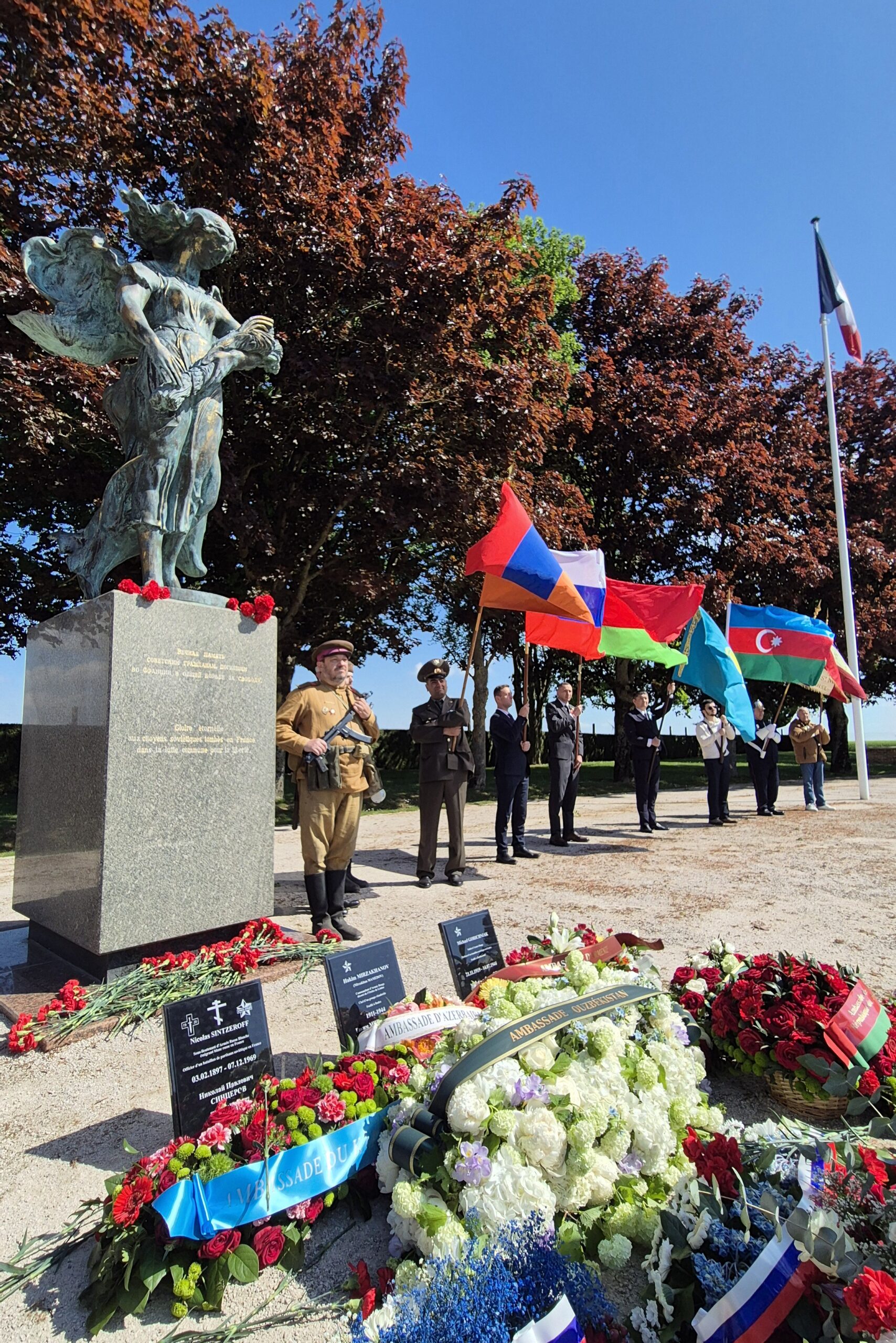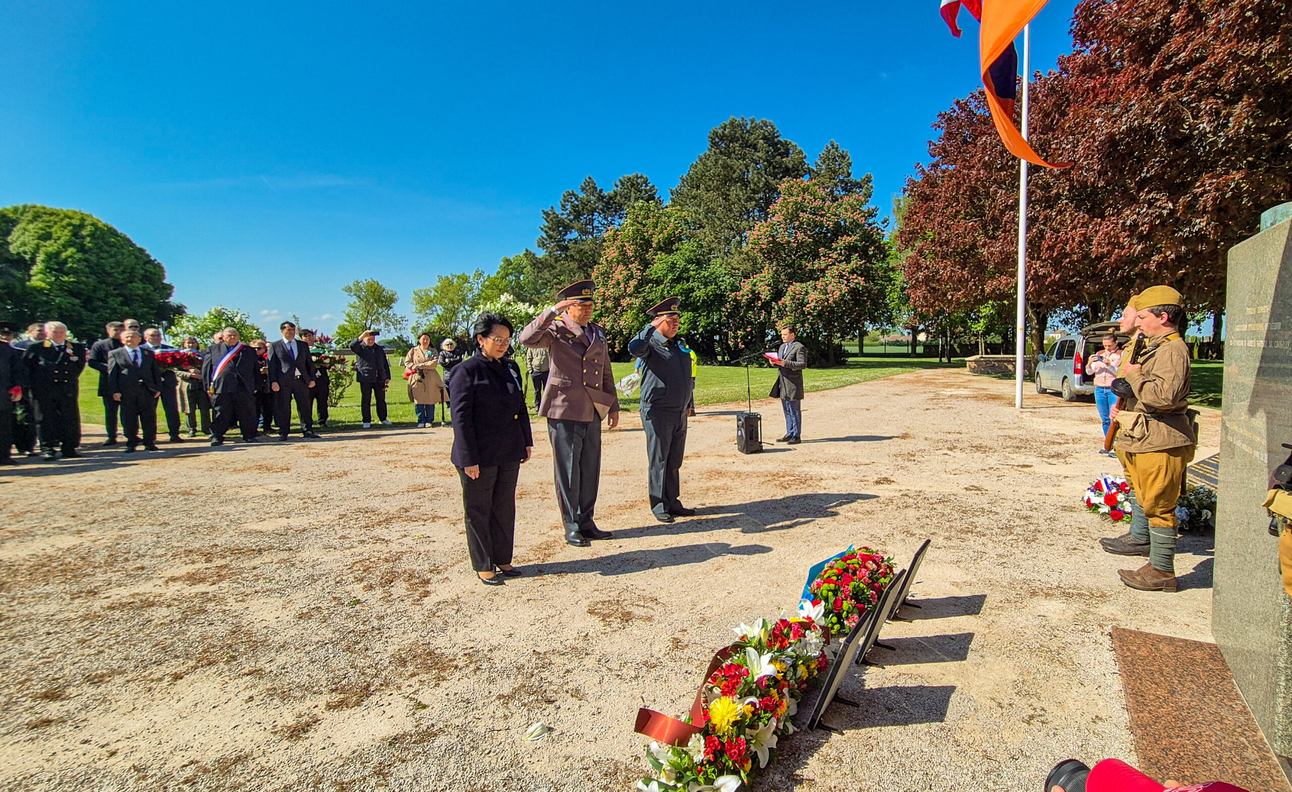 Нуайе-Сен-Мартен, 2025 жылғы 6 мамыр – Ұлы Отан соғысындағы Жеңістің 80 жылдығына орай Қазақстанның Франциядағы Елшісі Гүлсара Арыстанқұлова мен Әскери атташат аппаратының өкілдері Франция аумағында қаза тапқан кеңес жауынгерлеріне арналған ескерткішке гүл шоғын қою рәсіміне қатысты.