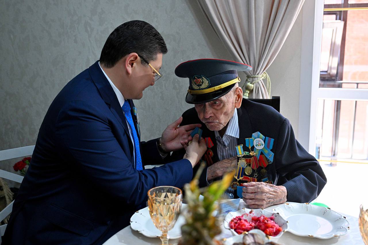 Облыс әкімі әуелі 104 жастағы соғыс ардагері, «Халық қаһарманы» Әбдіғали Қаймолдиннің шаңырағына барды. Әбдіғали Қаймолдин 1941 жылы әскер қатарына шақырылып, 1945 жылдың 9 мамырына дейінгі аралықта Сталинград, 1-Украина, 1-Беларусь, 3-Балтық майдандарына қатысады. Харьковті азат етуге атсалысады. 2023 жылы Мемлекет басшысы Қасым-Жомарт Тоқаевтың Жарлығымен 1941–1945 жылдардағы Ұлы Отан соғысында көрсеткен ерлігі, батылдығы, жанқиярлығы мен соғыстан кейін мемлекеттік және қоғамдық қызметке белсенді қатысқаны үшін «Халық қаһарманы» атағын беріліп, айрықша ерекшелік белгісі – Алтын жұлдыз және «Отан» орденімен марапатталды.
