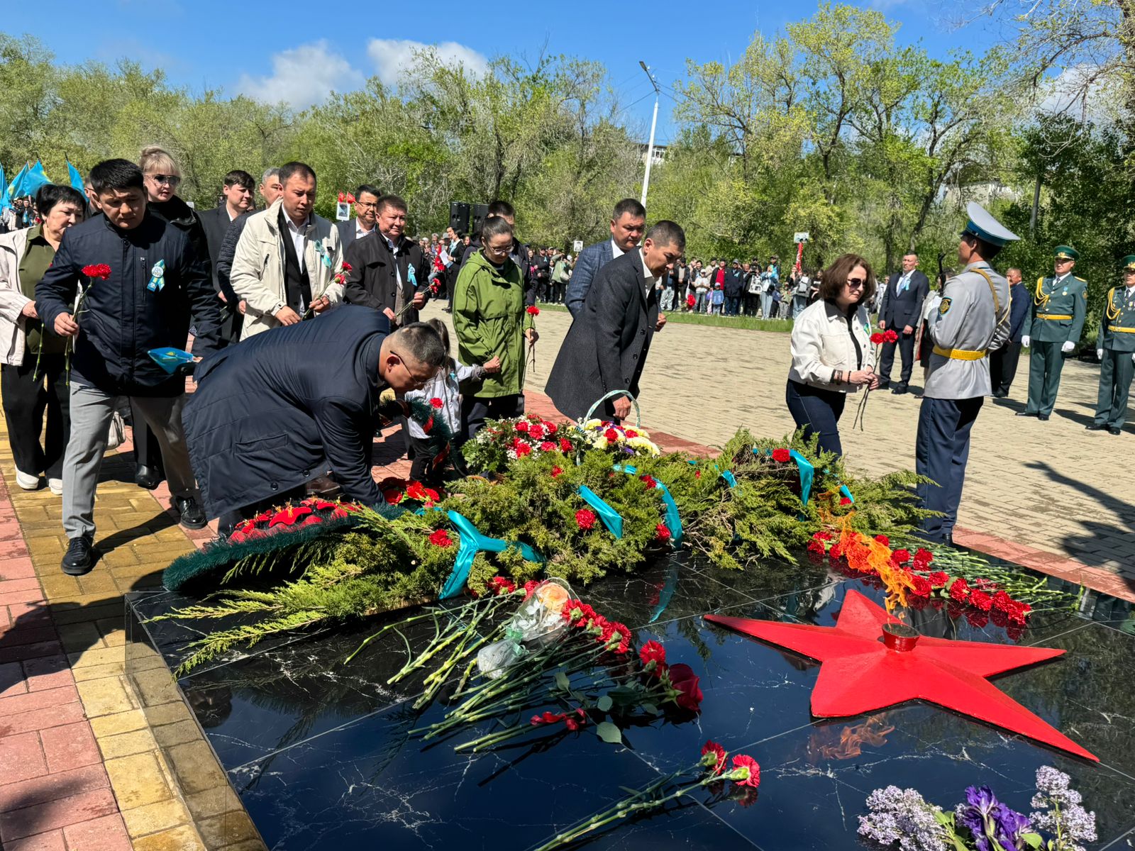 Сағат 11.00-де Жеңіс паркте Мемориалдық кешенінің мәңгілік алауға әшекейленген гүл тізбегі мен гүлдер қоюы болып өтті.