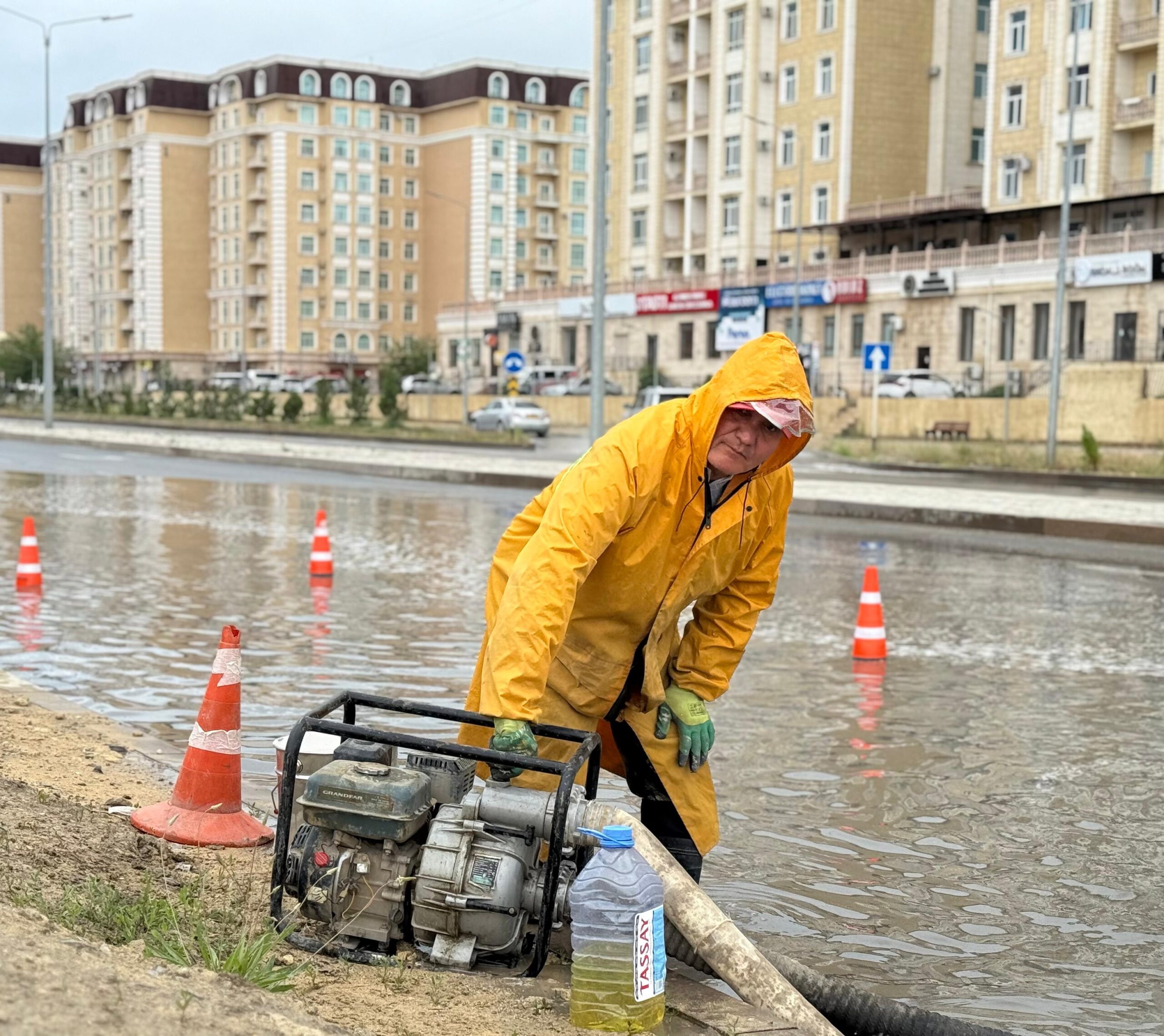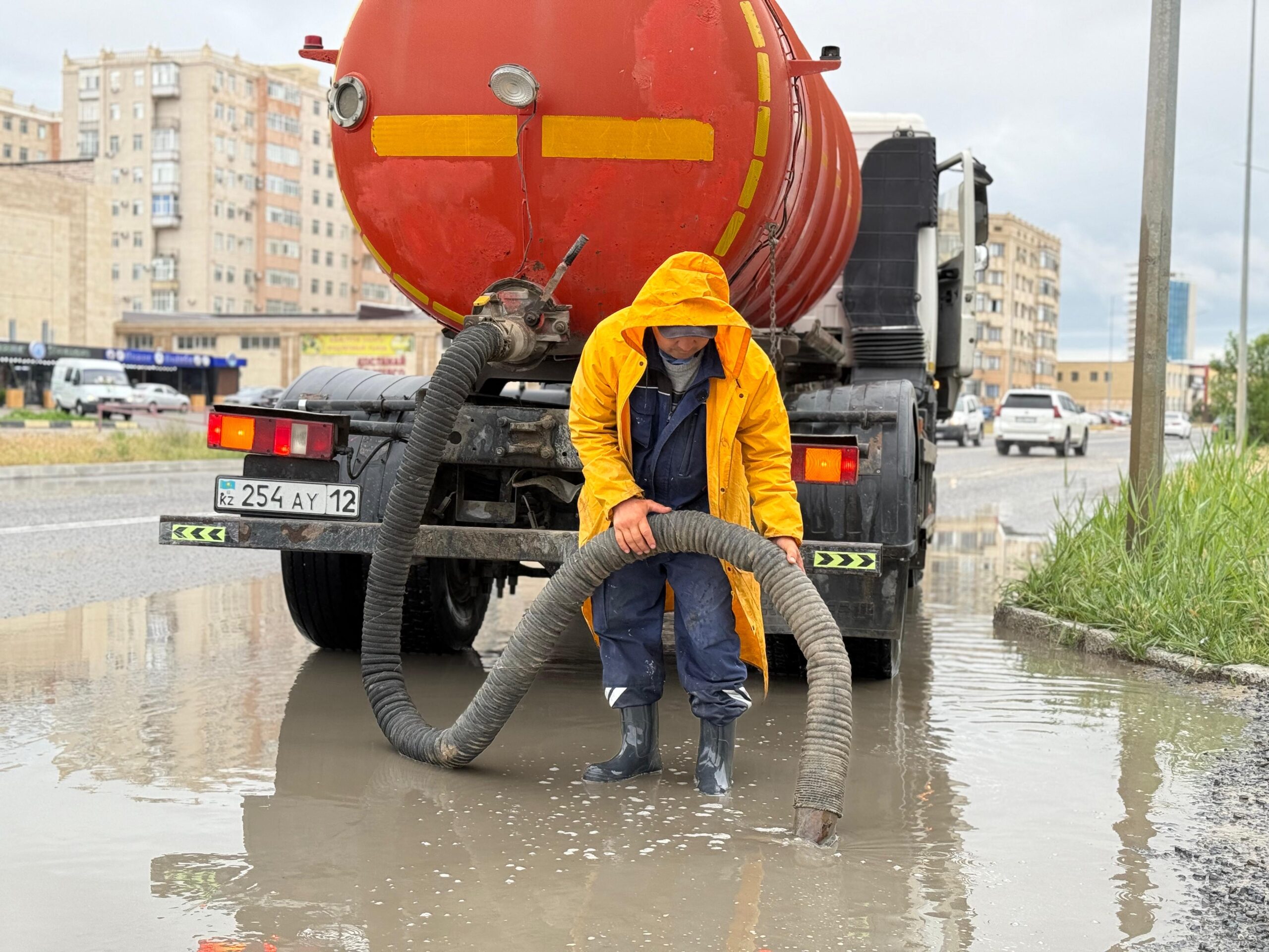 Ақтауда коммуналдық сала қызметкерлері автомобиль жолдарында жиналған жаңбыр суын сорып алу жұмыстарын жүргізді.