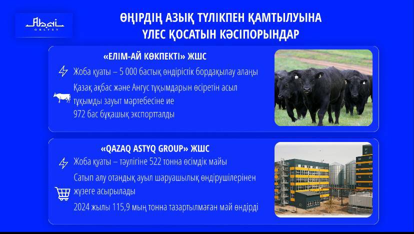«Бұл кәсіпорындар жаңа жұмыс орындарын ашып, өңірдің азық-түлікпен қамтылуына үлес қосады. Осы бағытта жұмысты жалғастырып, әкімдік тарапынан тиісті қолдау көрсетуге дайынбыз», – деді облыс әкімі.