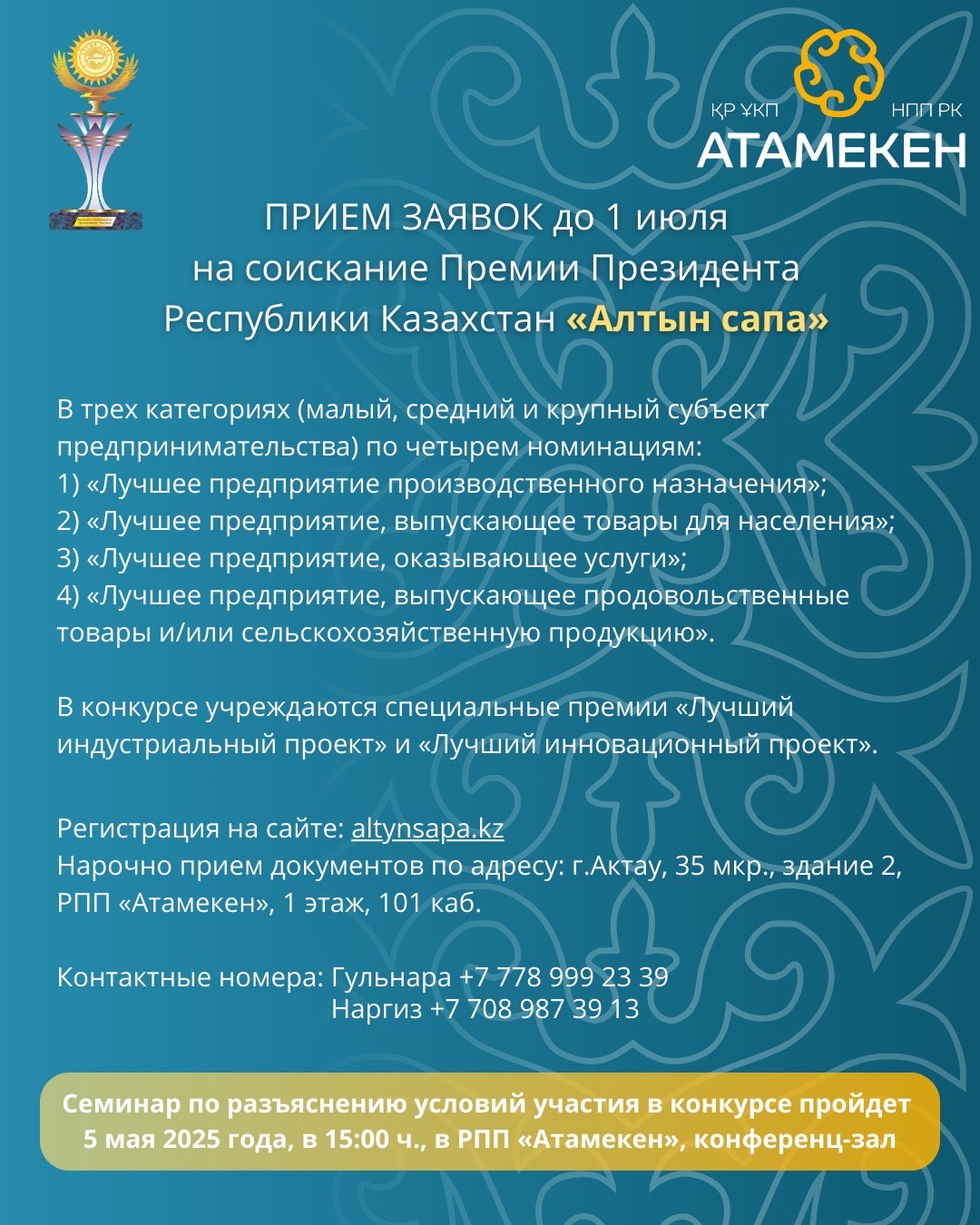 Маңғыстау облысының кәсіпкерлер Палатасы Қазақстан Республикасы Президентінің «Алтын сапа» сыйлығына үміткерлерден өтінім қабылдаудың басталғандығы туралы хабарлайды.
