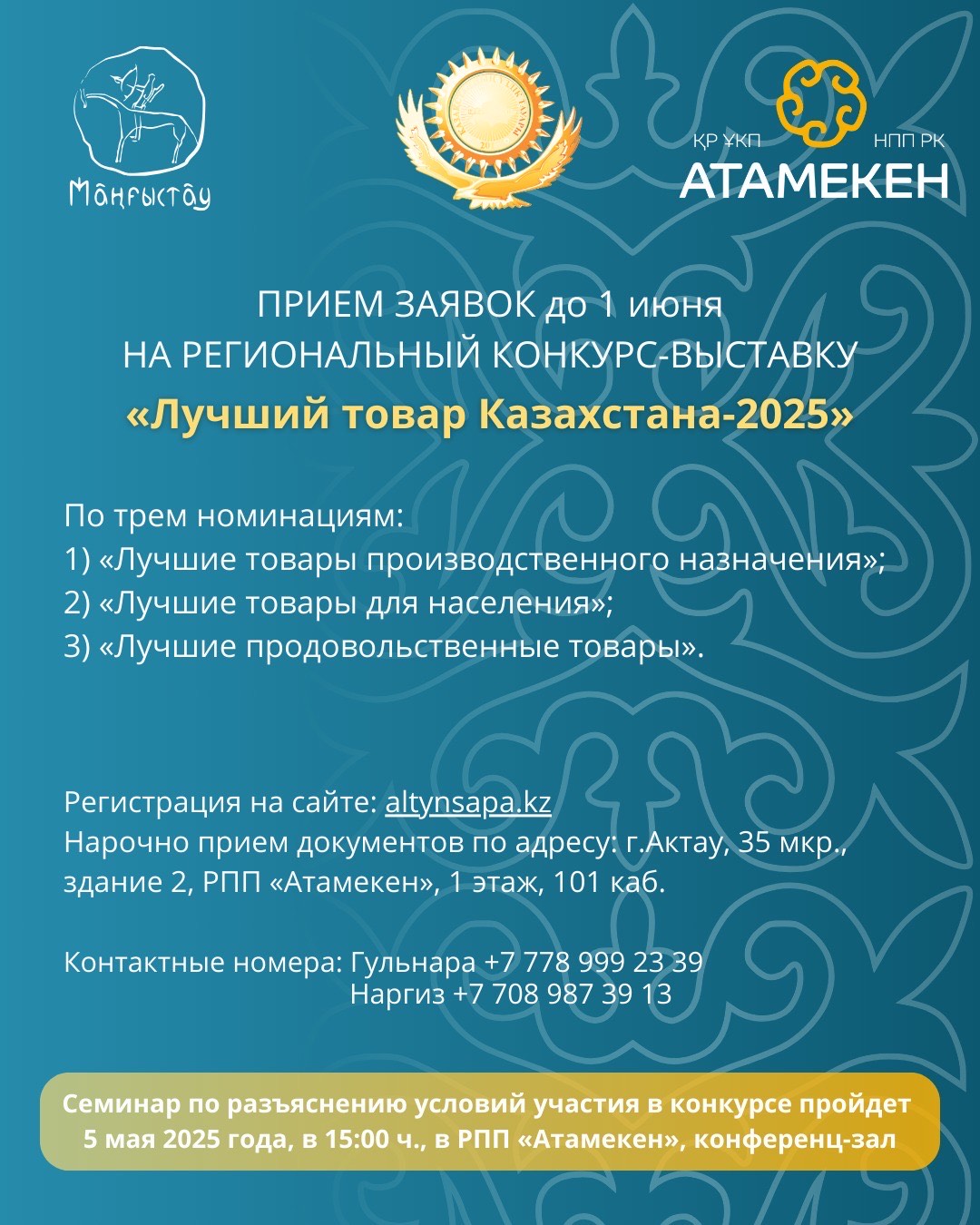 Маңғыстау облысының кәсіпкерлер Палатасы «Қазақстанның үздік тауары-2025» өңірлік көрме-кокурсына өтінім қабылдаудың басталғандығы туралы хабарлайды.