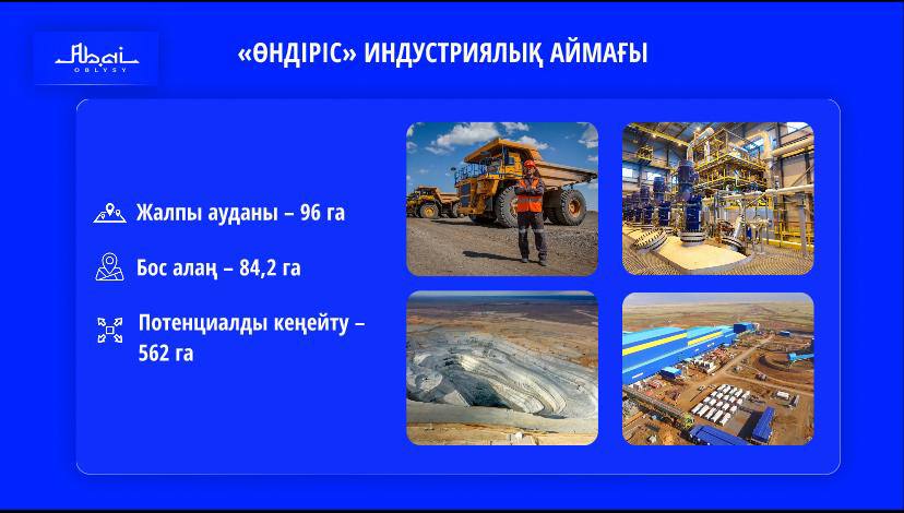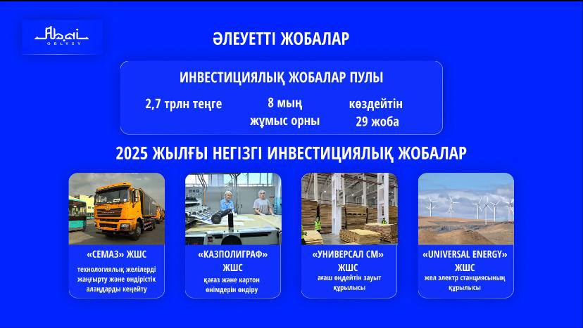 2028 жылға дейін жалпы құны 2,7 трлн теңге болатын 29 инвестициялық жоба жүзеге асырылады. 8 мың жаңа жұмыс орны ашу көзделіп отыр. Биыл 10 миллиард теңгеге «СемАз» ЖШС өнеркәсіптік алаңдары кеңейтіліп, жылына 6 мың арнайы техника шығаратын желі жаңартылады. «Казполиграф» ЖШС жылына қуаттылығы 40 миллион дана қағаз бен картон бұйымдары өндірісін іске қосады