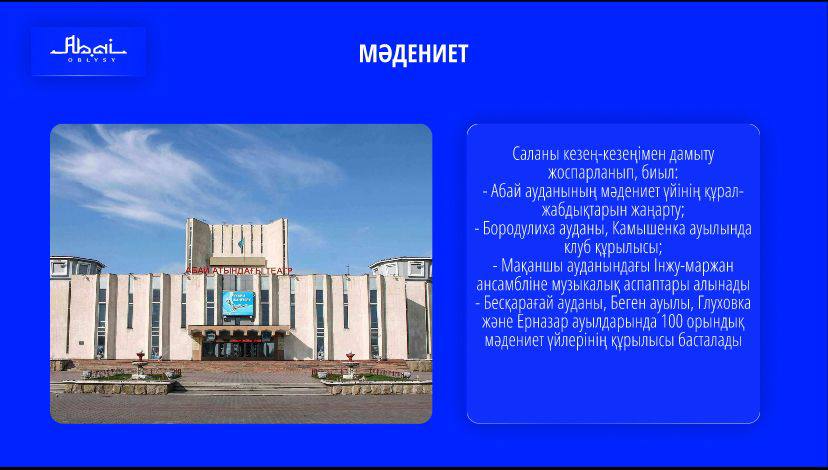 «Ұлы Абайдың 180 жылдығына орай Мемлекет Басшысының қолдауымен «Абайға құрмет» республикалық акция аясында еліміздің өзге өңірлері Семей қаласында музыкалық мектеп, облыстық орталық кітапхана, шығармашылық сарайы, өлкетану музейі, көрме орталығы және амфитеатр салатын болады», – деді аймақ басшысы.