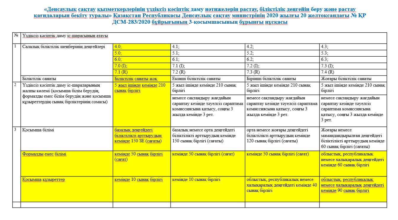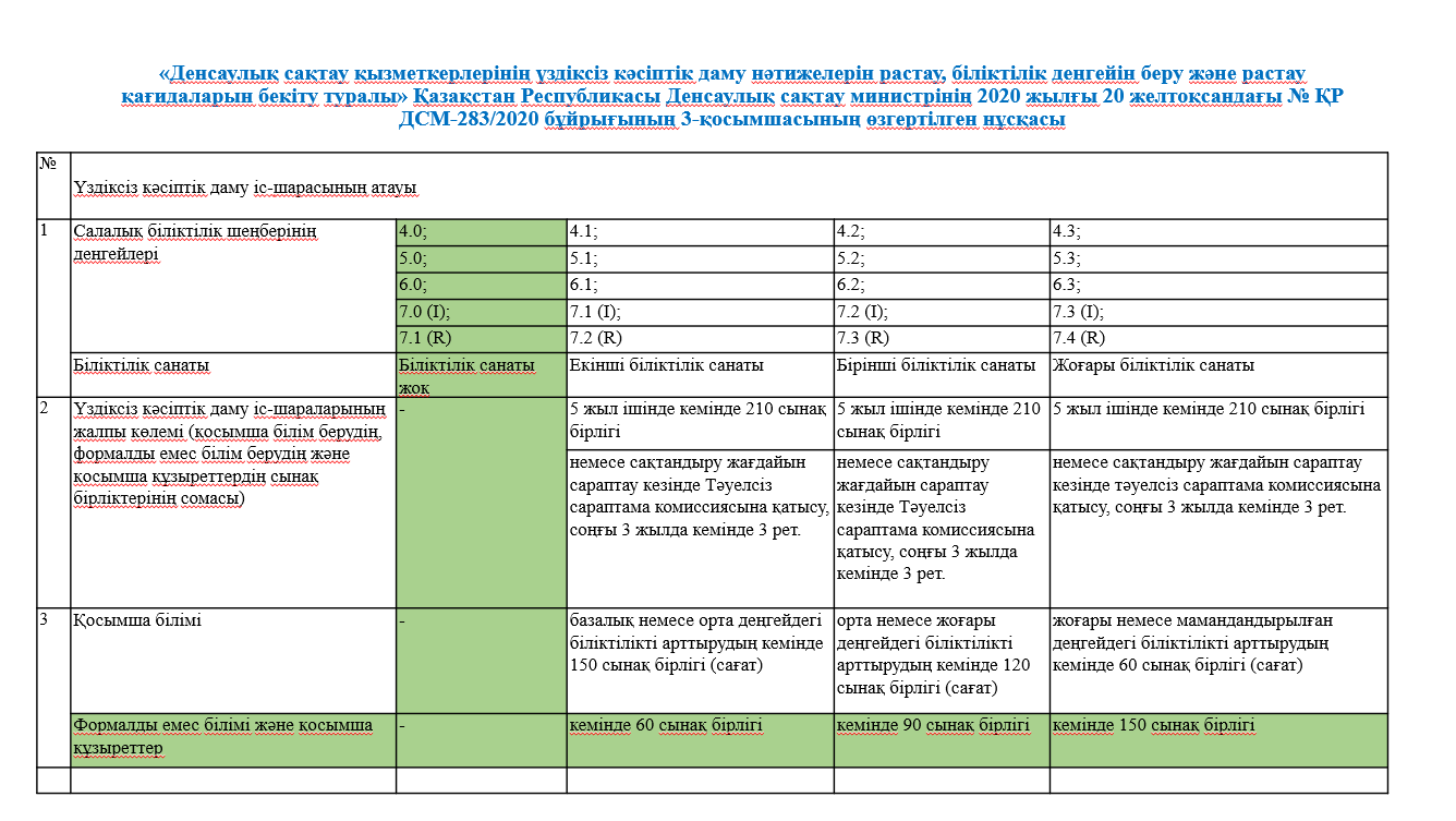 “Денсаулық сақтау қызметкерлерінің үздіксіз кәсіптік даму нәтижелерін растау, біліктілік деңгейін беру және растау қағидаларын бекіту туралы” Қазақстан Республикасы Денсаулық сақтау министрінің 2020 жылғы 20 желтоқсандағы № ҚР ДСМ-283/2020 бұйрығына өзгерістер мен толықтыру енгізу туралы Қазақстан Республикасы Денсаулық сақтау министрінің 2025 жылғы 1 сәуірдегі № 29 бұйрығына сәйкес 3-қосымшадағы өзгерістерге қатысты салыстырмалы кесте.