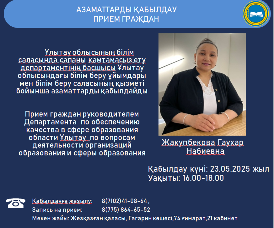 Ұлытау облысының білім саласында сапаны қамтамасыз ету департаментінің басшысы Ұлытау облысындағы білім беру ұйымдары мен білім беру саласының қызметі бойынша азаматтарды қабылдайды.