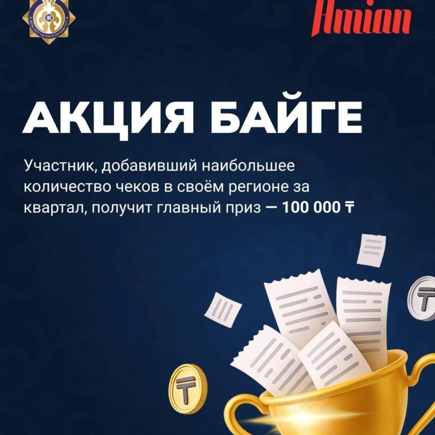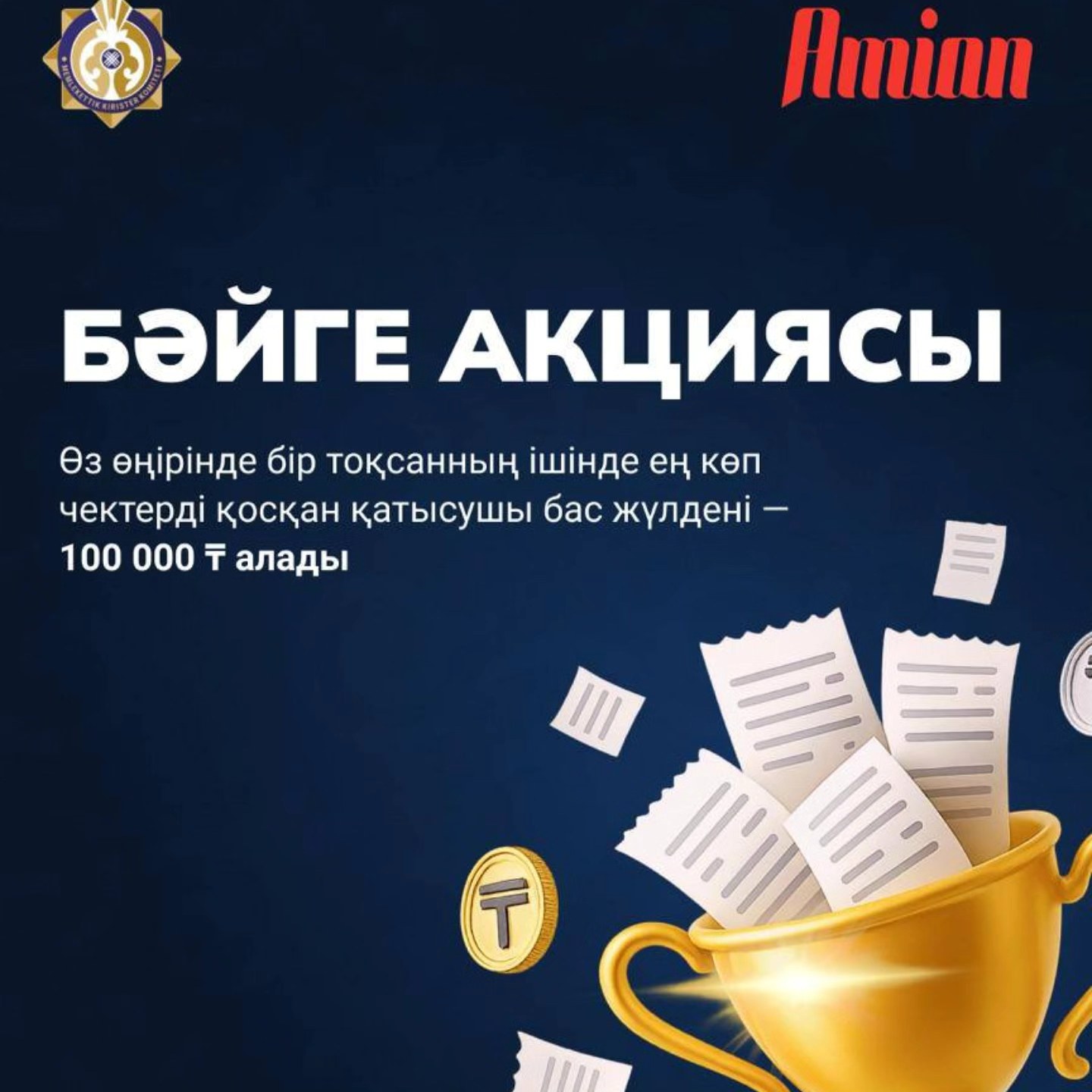 Мемлекеттік кірістер комитеті «Бәйге» атты жаңа акцияның өткізілетінін хабарлайды. Аталған акция аясында белгіленген кезеңде ең көп фискалдық чекті тіркеген жеке тұлғаларға 100 000 теңге көлемінде сыйақы беріледі. Акция 2025 жылғы 1 мамырдан бастап 31 желтоқсанға дейін бүкіл ел бойынша өткізіледі.