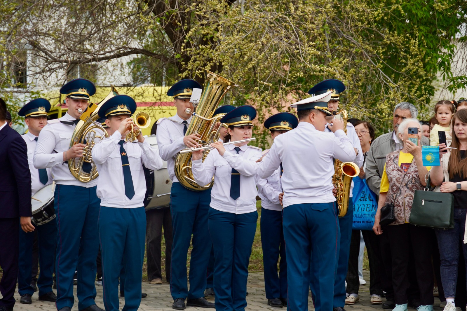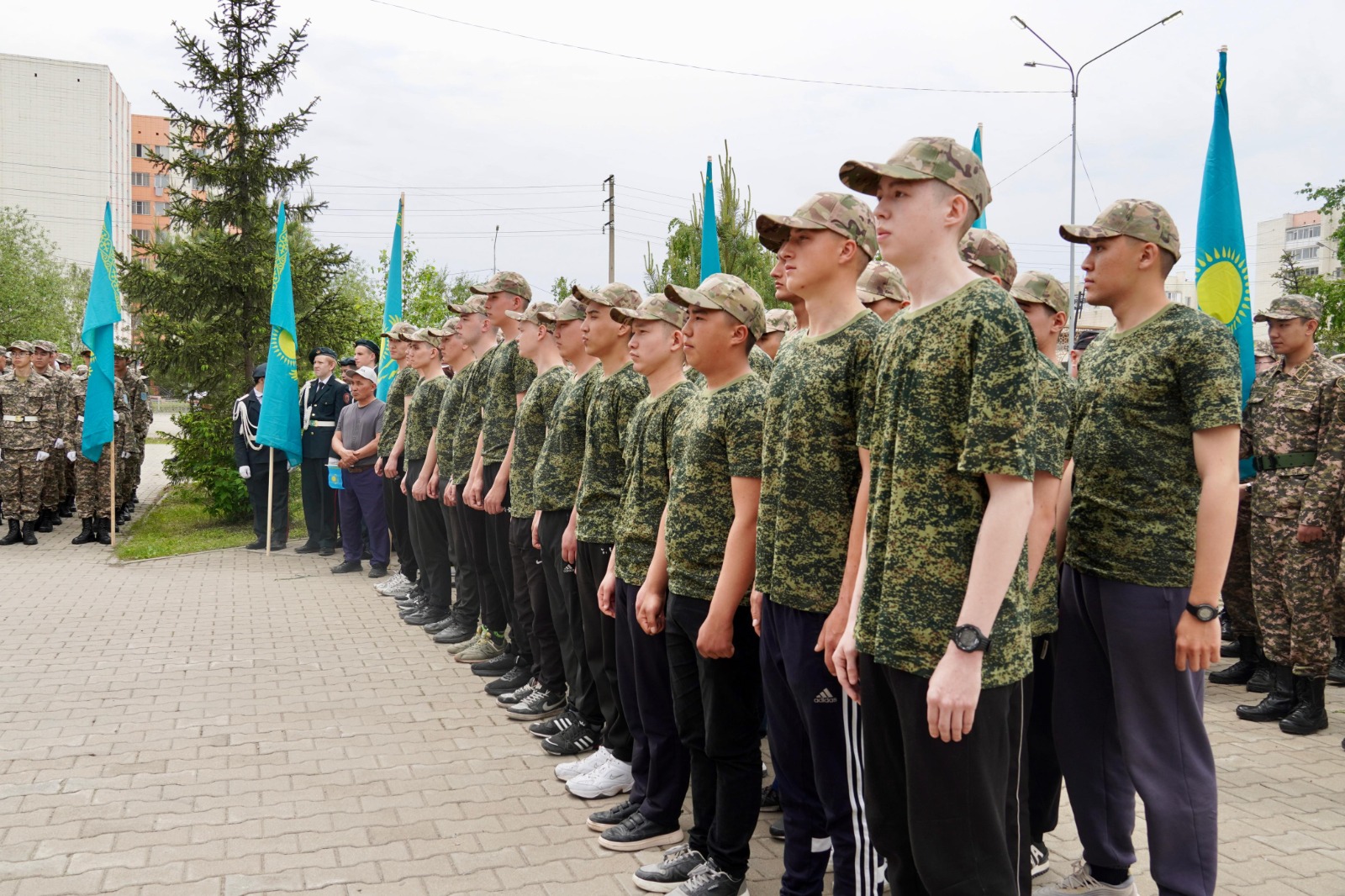 Сарбаздар әскери-техникалық мектеп курсанттарымен, 5510 әскери бөлімінің жауынгерлерімен және патриоттық клуб мүшелерімен бірге сап түзеді. Жастарға қажетті құрал-жабдықтары салынған армиялық сөмкелер салтанатты түрде табыс етілді.