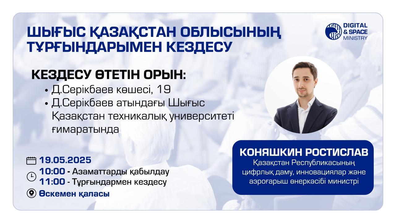 ҚР Цифрлық даму, инновациялар және аэроғарыш өнеркәсібінің вице-министрі Коняшкин Ростислав Анатольевич 19 мамырда сағат 10.00-де Д.Серікбаев атындағы Шығыс Қазақстан техникалық университеті ғимаратында министрліктің құзыретіне кіретін мәселелер бойынша Шығыс Қазақстан облысының азаматтарын қабылдайды және сағат 11:00-де тұрғындармен кездесу өткізеді (мекен-жайы: Өскемен қаласы, Д.Серікбаев көшесі, 19).