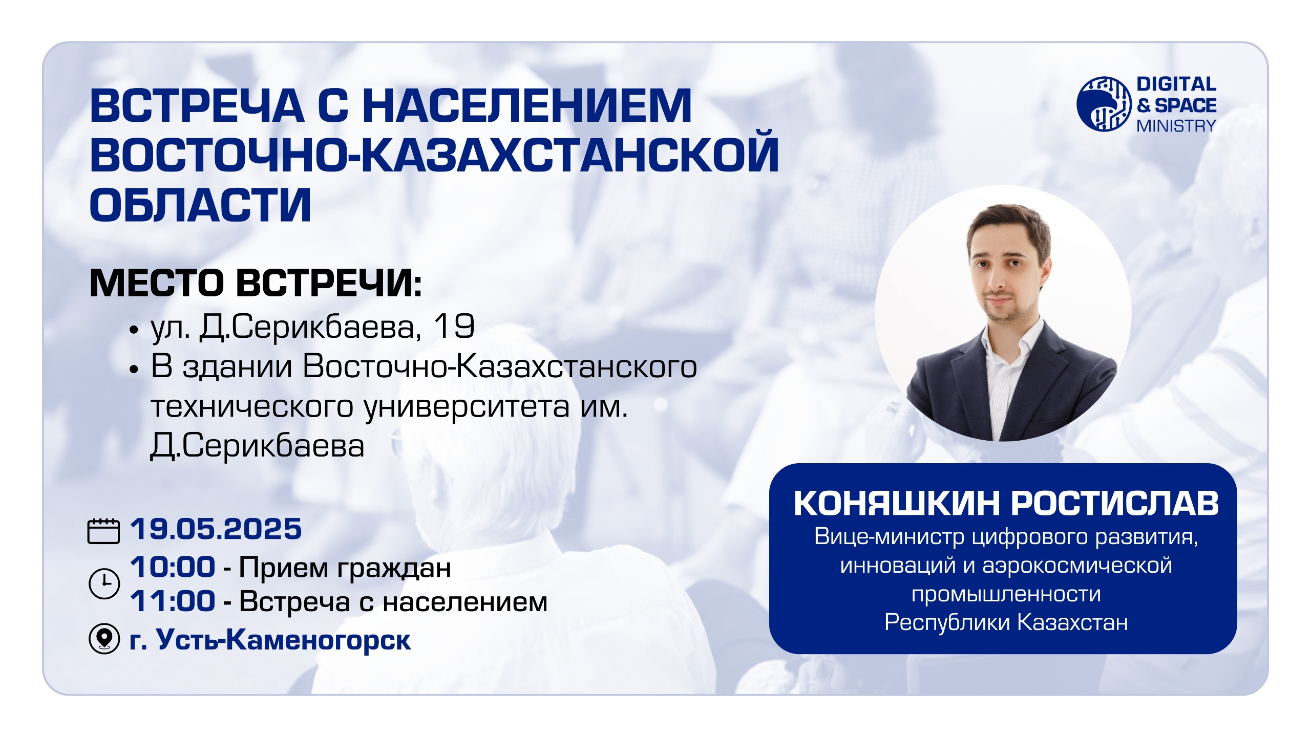 ҚР Цифрлық даму, инновациялар және аэроғарыш өнеркәсібінің вице-министрі Коняшкин Ростислав Анатольевич 19 мамырда сағат 10.00-де Д.Серікбаев атындағы Шығыс Қазақстан техникалық университеті ғимаратында министрліктің құзыретіне кіретін мәселелер бойынша Шығыс Қазақстан облысының азаматтарын қабылдайды және сағат 11:00-де тұрғындармен кездесу өткізеді (мекен-жайы: Өскемен қаласы, Д.Серікбаев көшесі, 19).