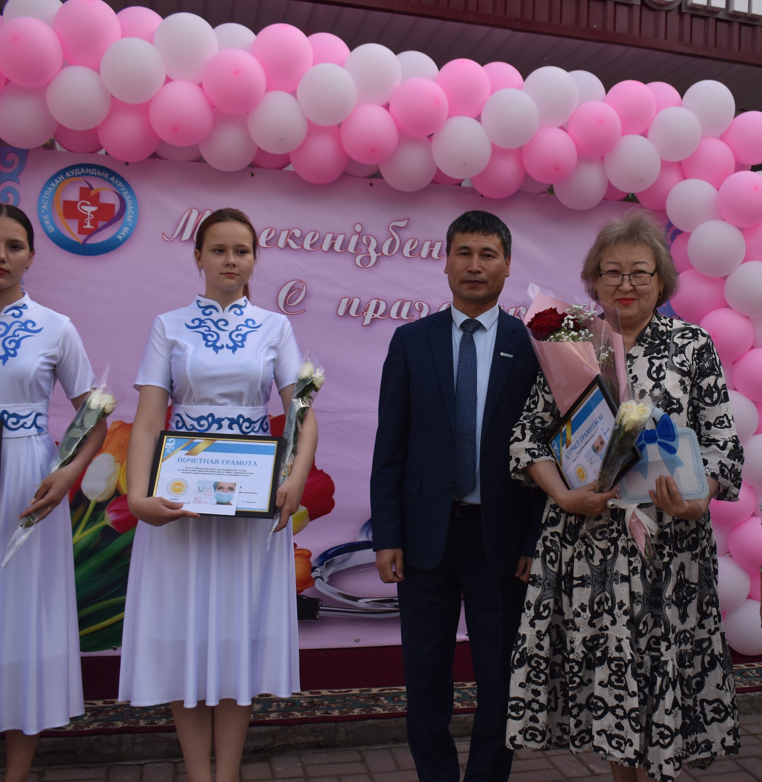 Сондай-ақ, Астрахан аудандық ауруханасының бас дәрігері Әсемгүл Қабиденқызына құттықтау және Құрмет грамоталарын табыстау үшін сөз берілді. Бас дәрігердің атынан: №1 Жалтыр орта мектебінің медбикесі, №2, учаскелік балалар консультациясының медбикесі, хирургиялық бөлімшенің посттық медбикесі, рентген-зертханашы марапатталды.