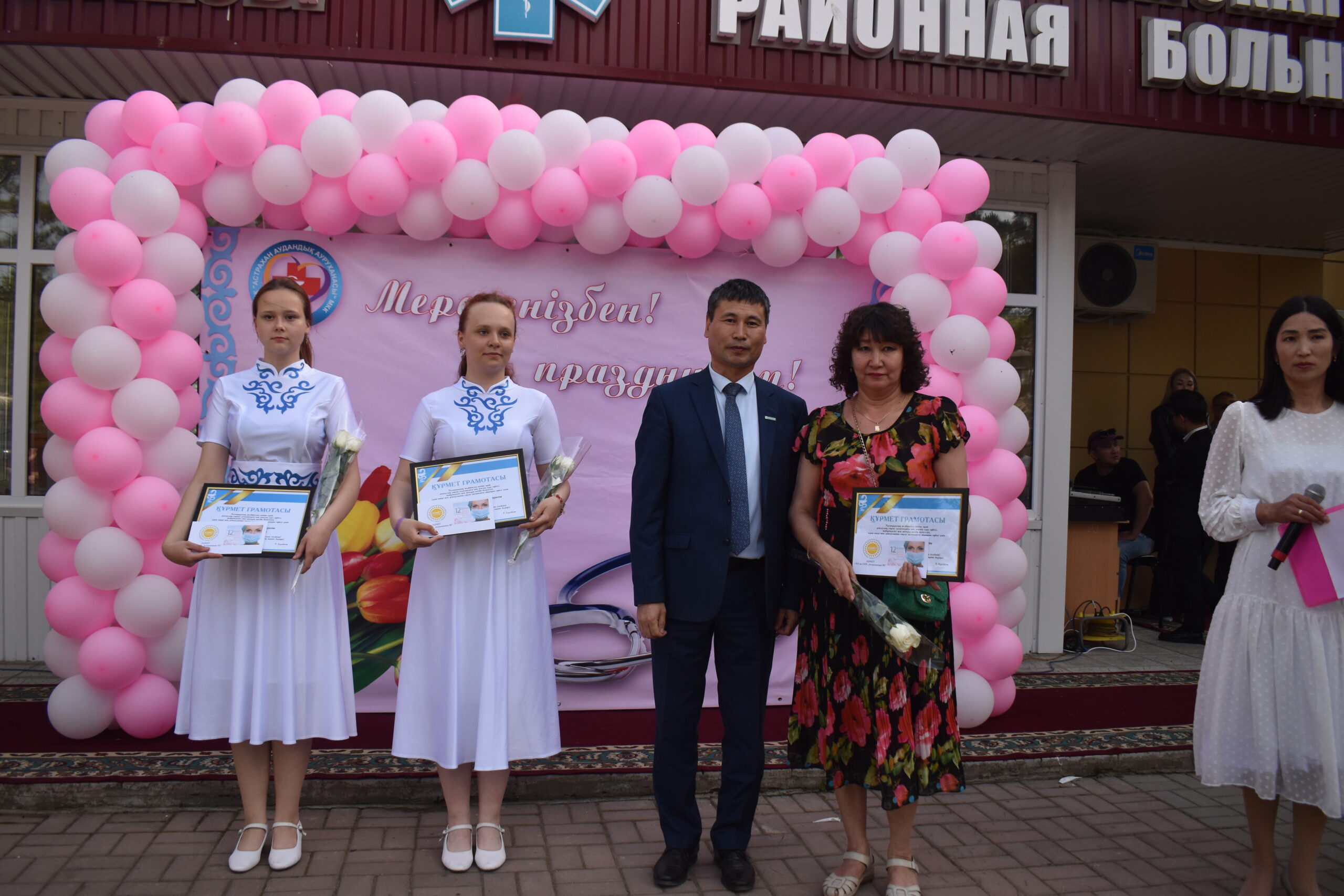 Құрмет грамоталарымен: қан құю бойынша медбике, Первомайка ауылы, Зеленое және жаңа Крлутон ауылының фельдшері, тексеру кабинетінің медбикесі, Жалтыр ауылының зертханашысы, дәрігерге дейінгі кабинеттің медбикесі, перзентхана бөлімшесінің акушері марапатталды.