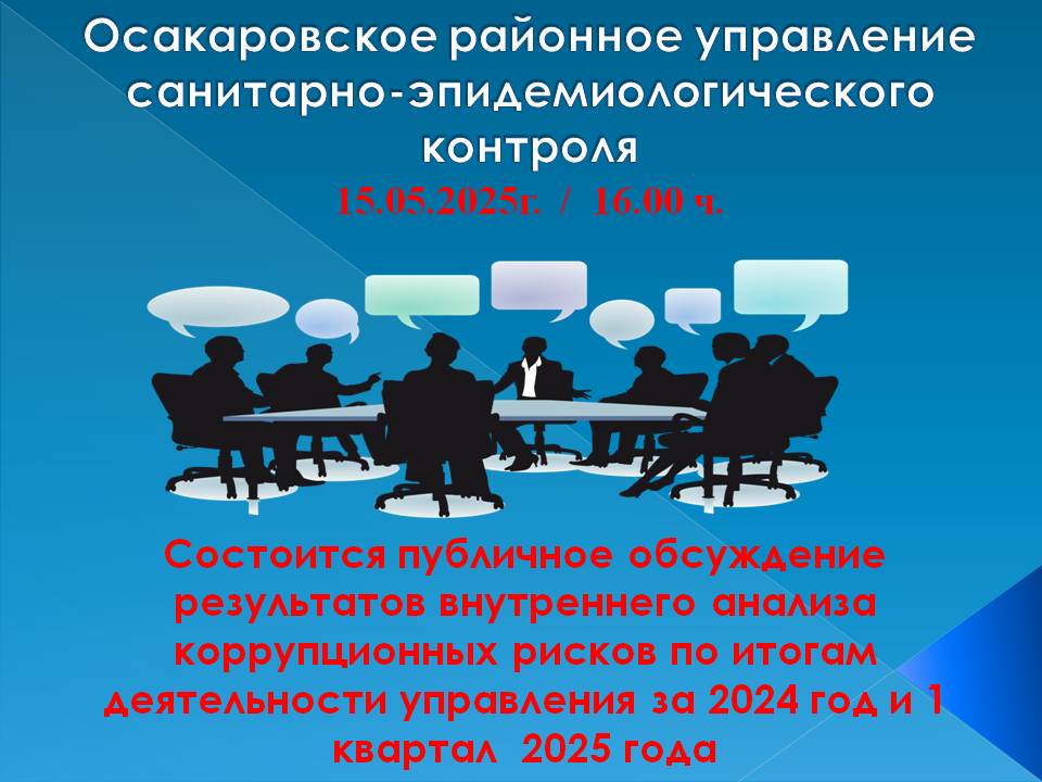 Осакаровское районное управление санитарно-эпидемиологического контроля сообщает, что 15 мая 2025 года в 16.00 часов будет проводится публичное обсуждение результатов внутреннего анализа коррупционных рисков по итогам деятельности Управления по итогам 2024 год и 1 квартал 2025 года. Обсуждение будет проходить по адресу: п. Осакаровка, ул.Х.Байгабылов 50/1. Справки по телефону: 8 (72149) 4-19-09 Асташова Снежана Федоровна (Руководитель управления).