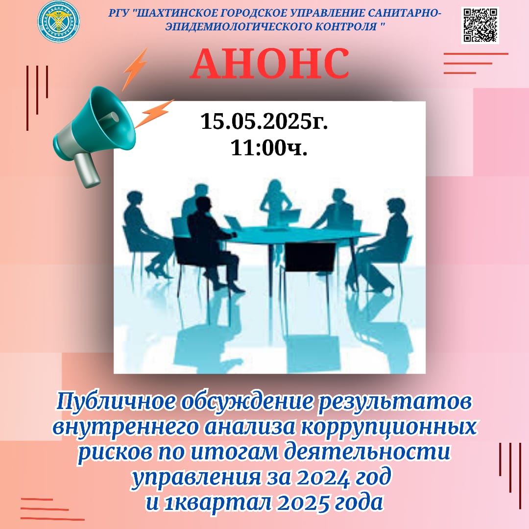 15 мая 2025 года в 11 часов 00 минут на базе «Шахтинского городского управления санитарно – эпидемиологического контроля» с участием исполнительного секретаря Шахтинского городского филиала Карагандинской области общественного объединения партия «АMANAT» состоится публичное обсуждение результатов внутреннего анализа коррупционных рисков по итогам 2024 года и 1 полугодия 2025года по адресу: г. Шахтинск, ул. Ленинградская 81. Справки по телефону: 8(72156)50679