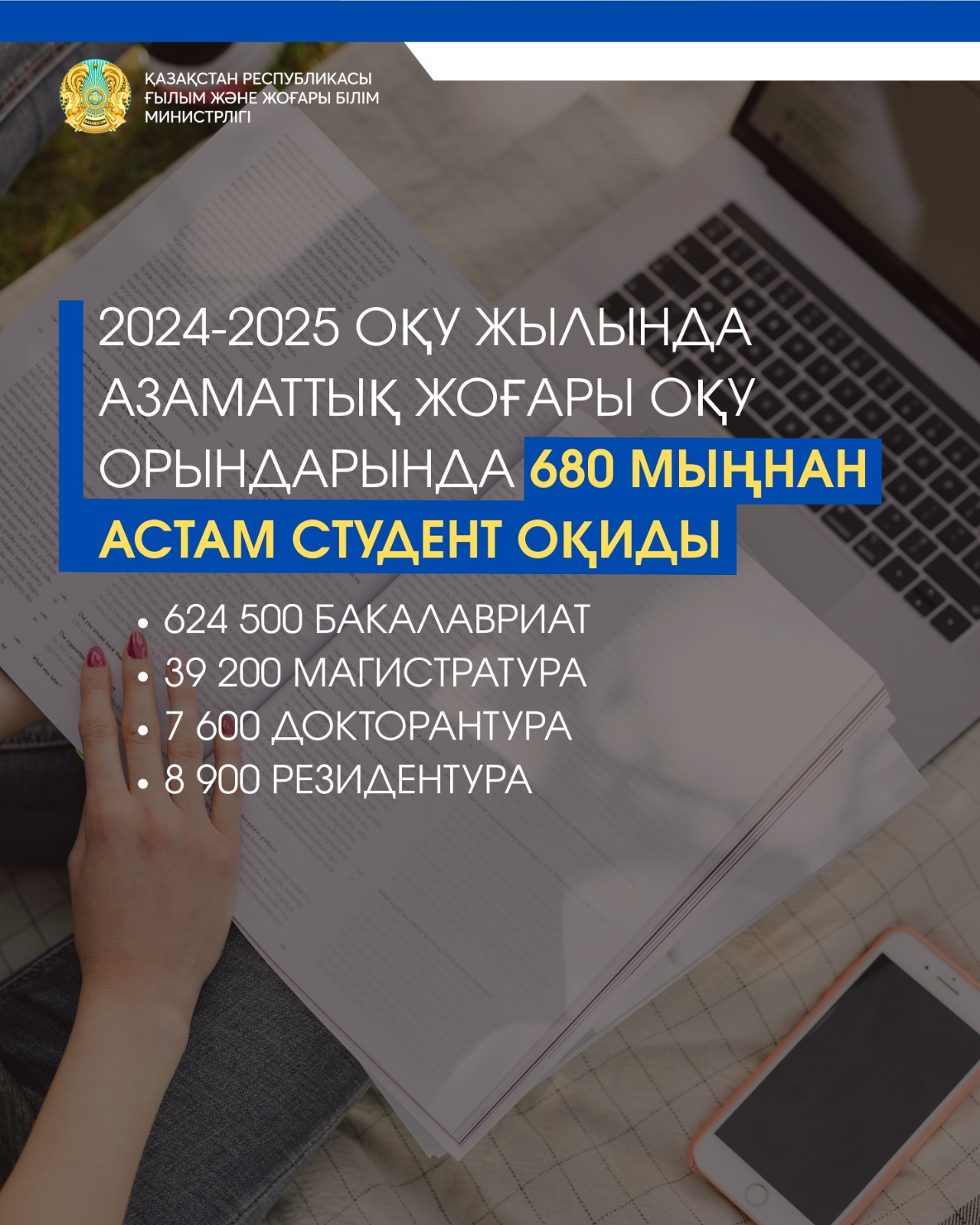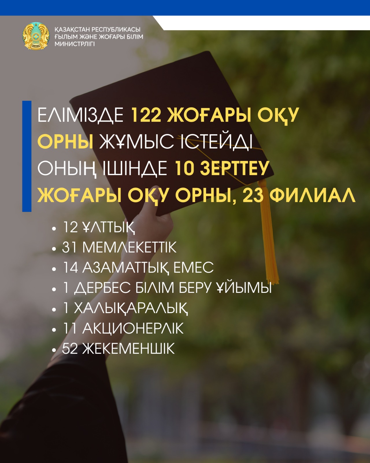 Бүгінгі таңда республикада 122 жоғары оқу орны жұмыс істейді, оның ішінде 10 зерттеу жоғары оқу орны және 23 шетелдік университет филиалдары бар. 2024-2025 оқу жылында азаматтық жоғары оқу орындарында 680 мыңнан астам студент оқиды, оның ішінде 624 500 бакалавриатта, 39 200 магистратурада, 7 600 докторантурада және 8 900 резидентурада білім алып жатыр. Айта кету керек, биылғы көрсеткіштер бойынша шетелдік студенттер саны 31,5 мыңды құрайды. Алғаш рет Азия елдерінен келген студенттер саны ТМД елдерінен келген білім алушылар санынан асып түсті: Азия елдерінен – 17 456 адам, ТМД елдерінен – 12 816 адам.