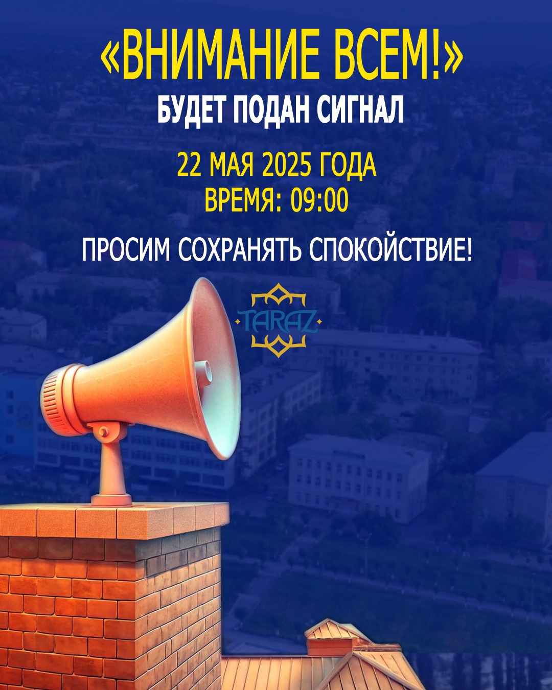 Жамбыл облысы Төтенше жағдайлар департаментінің Тараз қалалық Төтенше жағдайлар басқармасы «Өрт-2025» республикалық командалық-штабтық оқу-жаттығуының өткізілуіне байланысты 2025 жылы 22 мамыр күні, сағат 09:00-де қала аумағында электр сиреналары арқылы «Баршаның назарына!» сигналын беру жүргізілетіндігін хабарлайды.