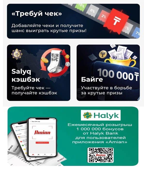 Енді сіздердің әрқайсысыңыз күнделікті сатып алулар жасай отырып немесе ақылы қызметтерді ала отырып, тек фискалдық түбіртек алып қана қоймай, бағалы сыйлықтарды, соның ішінде ақшалай сыйлықтарды ұтып ала аласыз. Алынған түбіртекті «Amian» мобильді қосымшасында тіркесеңіз болғаны.