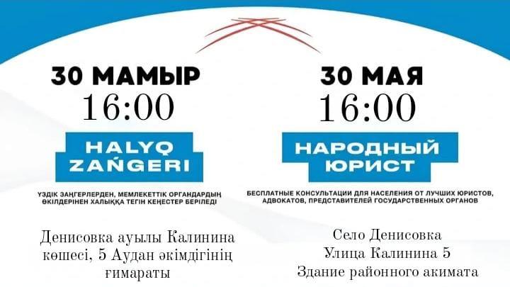 2025 жылғы 30 мамырда, сағат 16:00-де «Халықтық заңгер» акциясы өтеді. 2022 жылғы 31 желтоқсанда Қазақстан Республикасының Үкіметінің №1147 Қаулысымен бекітілген әртүрлі мақсатты топтар деңгейінде ақпараттық жұмыс жүргізу жөніндегі іс-шаралар жоспарына сәйкес, акция аясында халыққа тегін заңгерлік көмек көрсететін заңгерлер, адвокаттар және сарапшылар қатысады. Іс-шара Қостанай облысы, Денисовка ауылы, Калинин көшесі 5 мекен жайында орналасқан аудандық әкімдік ғимаратының 1-қабатта өтеді