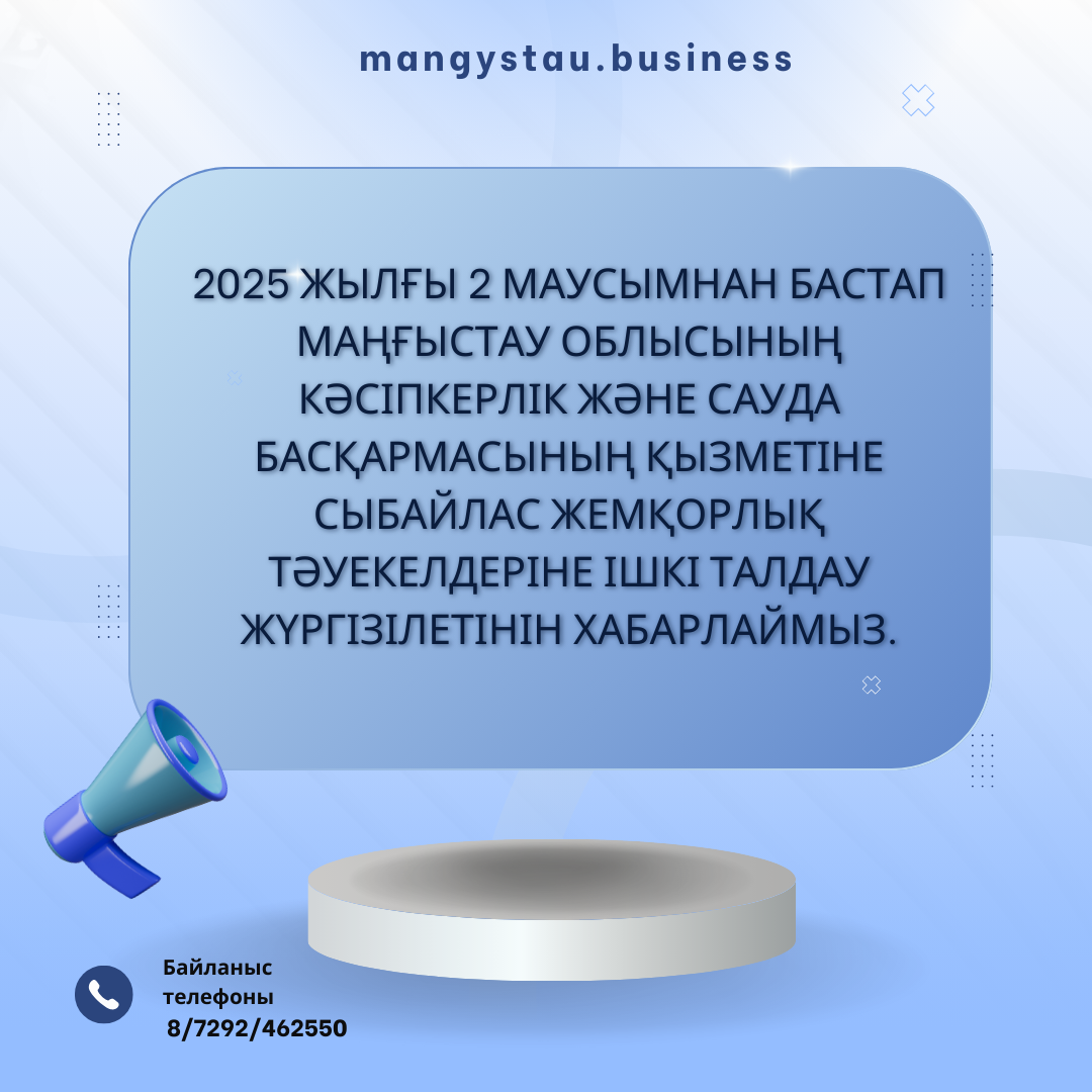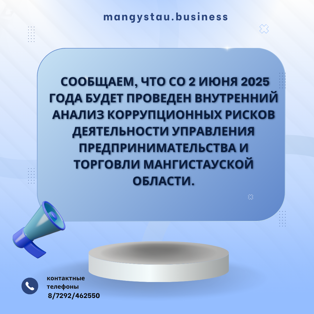 2025 жылғы 2 маусымнан бастап Маңғыстау облысының кәсіпкерлік және сауда басқармасының қызметіне сыбайлас жемқорлық тәуекелдеріне ішкі талдау жүргізілетінін хабарлаймыз.
