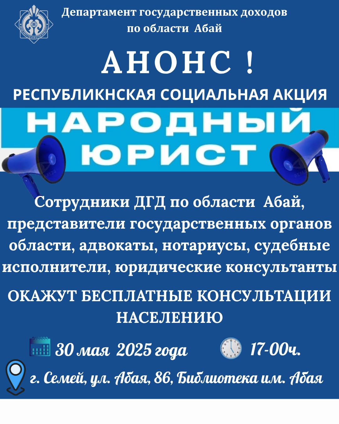📢 Абай облысы бойынша мемлекеттік кірістер департаменті ағымдағы жылдың 30 мамырында сағат 17:00-де Семей қаласында және өңірдің барлық аудан орталықтарында «Халық заңгері» жалпы республикалық акциясы өтетінің хабарлайды.