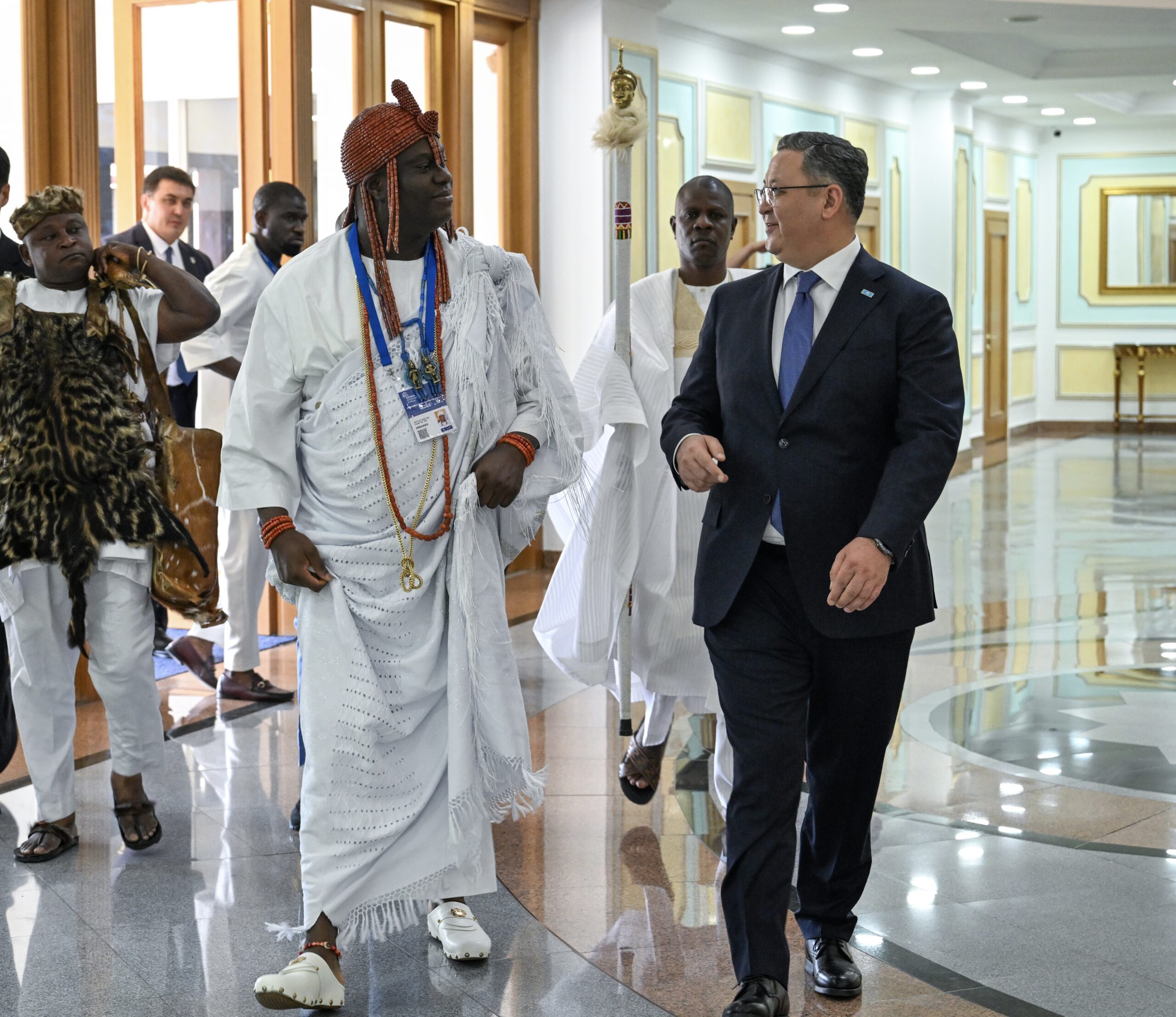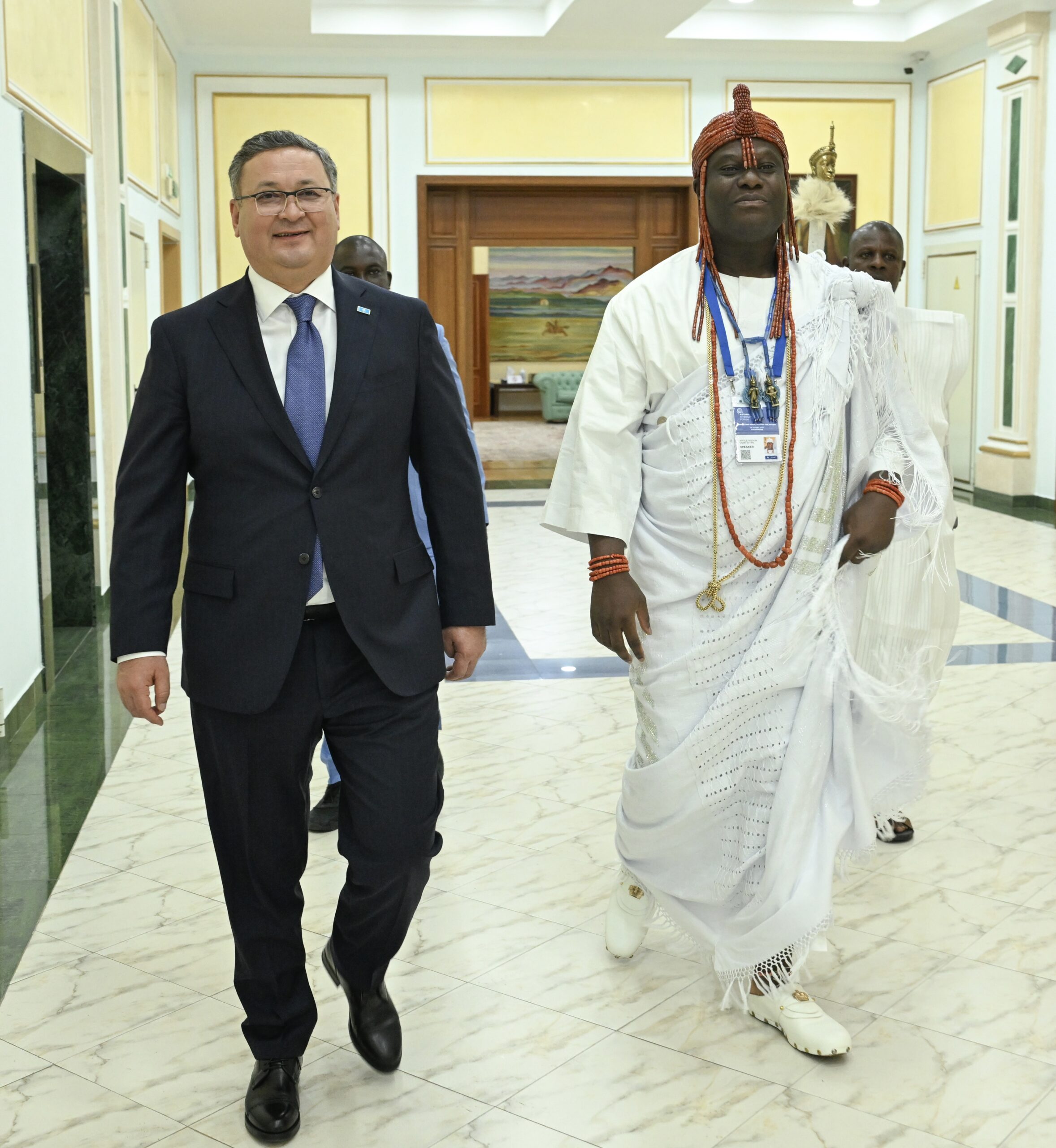 Астана, 2025 жылғы 30 мамыр – Қазақстан Республикасы Премьер-министрінің орынбасары – Сыртқы істер министрі Мұрат Нұртілеу Қазақстанға сапармен және Астана халықаралық форумына қатысу үшін келген Нигерияның ең беделді дәстүрлі көшбасшыларының бірі және йоруба халқының рухани жетекшісі – Ифе Королі Адейейе Энитан Огунвусимен кездесу өткізді.