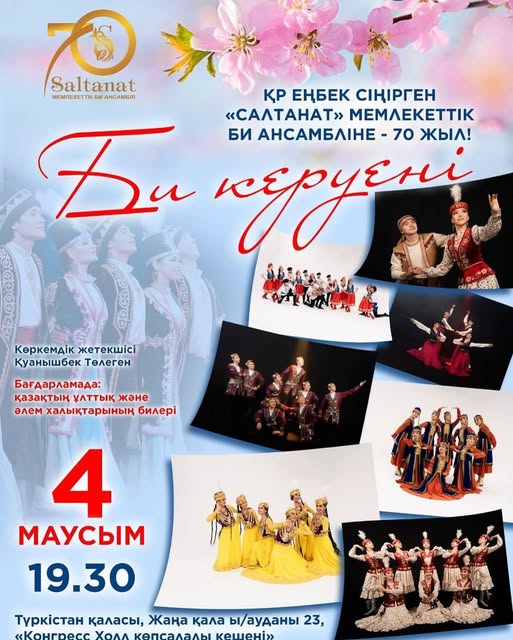 ҚР Қаржылық мониторинг агенттігінің ұйымдастыруымен және Түркістан облысы әкімінің қолдауымен өтетін «ЗАҢ және ТӘРТІП. Қаржылық қауіпсіздік» форумы аясында 4 маусым күні ҚР «Салтанат» мемлекеттік би ансамблінің 70 жылдық мерейтойына арналған «БИ КЕРУЕНІ» атты концертке шақырамыз.