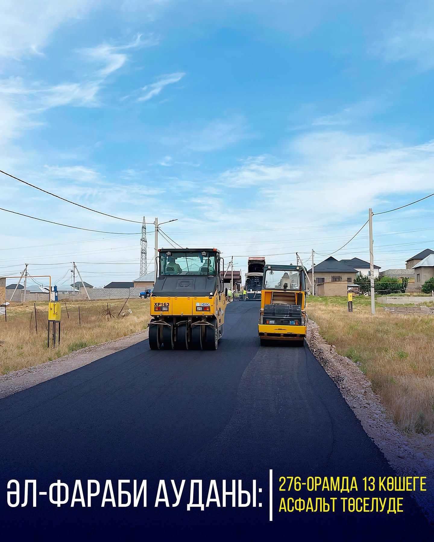 Бүгінде 2025 жылға арналған жол инфрақұрылымын дамыту жоспарына сәйкес, Әл-Фараби ауданына қарасты 276-орамда жалпы ұзындығы 5,7 шақырымды құрайтын 13 көшеге асфальт төсеу жұмыстары жүргізілуде. Атап айтқанда, Атауы жоқ №9, №10, №11, №12, №13, №14, №15, №16, №17 көшелері, сондай-ақ Ақжарма көшесі мен көше тұйықтары асфальттеліп жатыр.