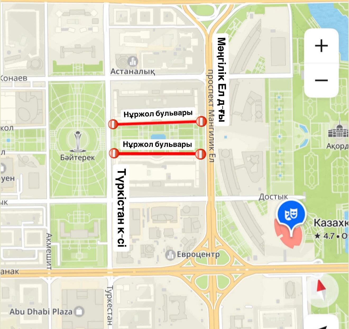 Осыған байланысты 7-11 мамыр аралығында алдымен Мәңгілік Ел даңғылынан Түркістан көшесіне дейін, содан кейін Түркістан көшесінен Мәңгілік Ел даңғылына дейінгі аралықта қозғалыс кезең-кезеңімен жабылатын болады. Учаскелердегі қозғалыс толығымен жабылады.