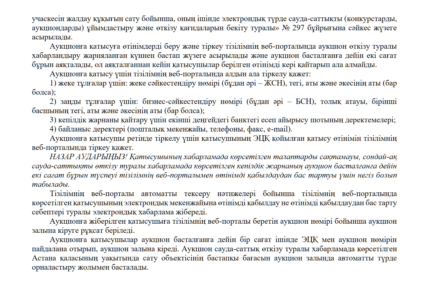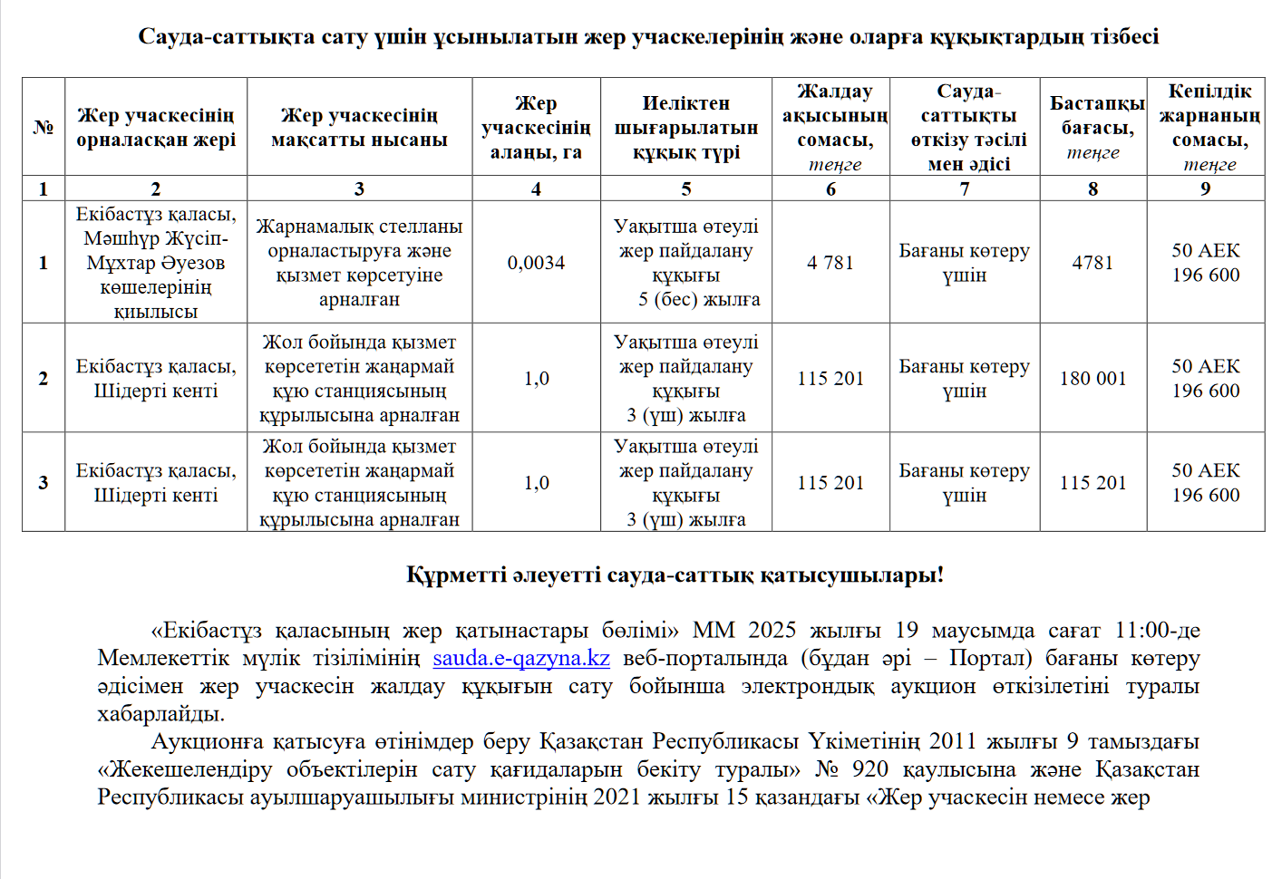 «Екібастұз қаласы әкімдігінің жер қатынастары бөлімі» ММ 2025 жылғы 19 маусымда сағат 11:00-де sauda.e-qazyna.kz электрондық сауда-саттық алаңында бағаны көтеру арқылы электрондық аукцион өткізеді.