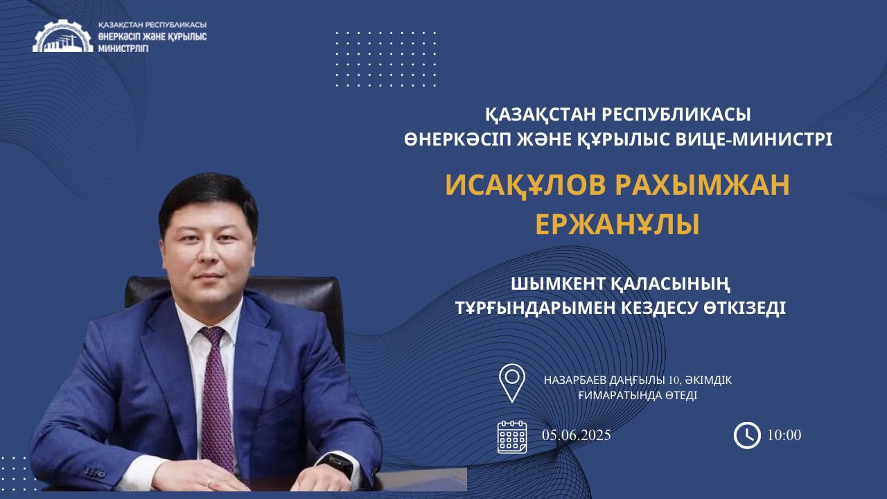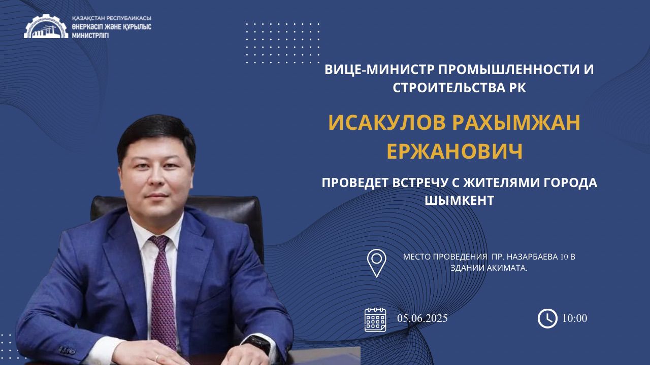 ҚР Өнеркәсіп және құрылыс вице-министрі Рахымжан Исақұлов Шымкент қаласының тұрғындарымен кездесу өткізеді.