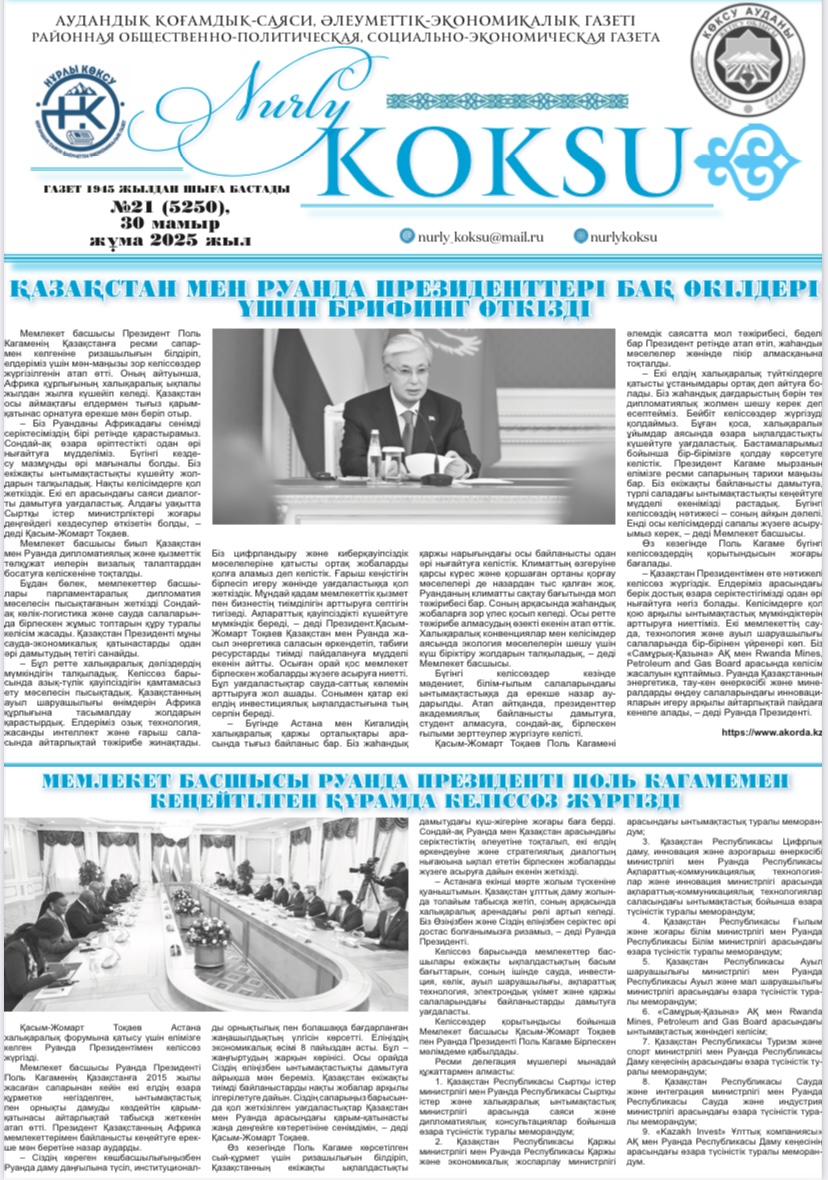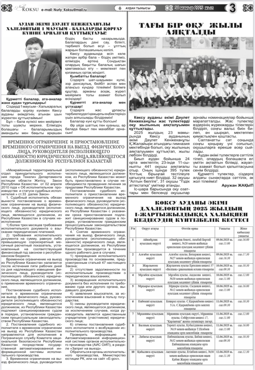 30.05.2025 жылы аудандық «Нұрлы Көксу» газетінің №21(5250) санында Жетісу облысы Әділет департаментінің Текелі қалалық мәжбүрлеп орындату аумақтық бөлімінің «ҚР борышкер болып табылатын жеке тұлғаның, заңды тұлға басшысының шығуына уақытша шектеу және уақытша шектеуді тоқтата тұру» мақаласы жарияланды.