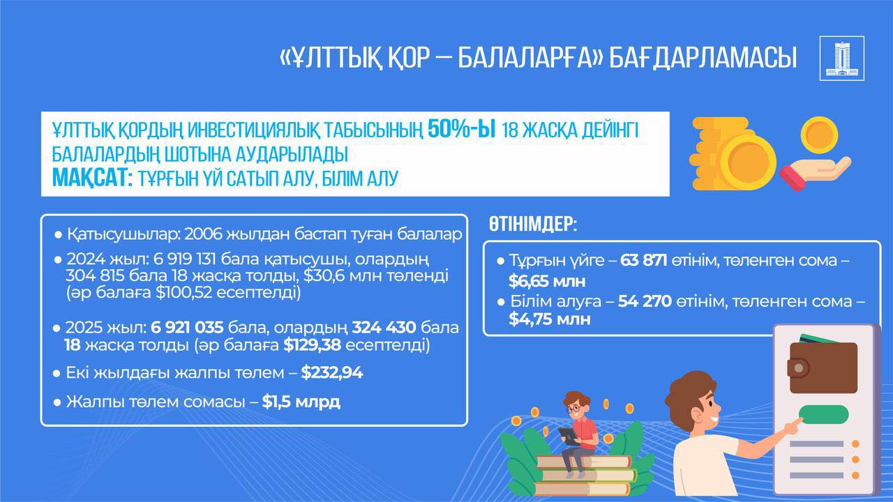 Есептеудің жалпы сомасы $695,5 млн-ды құрады. Ұлттық қордан ақша есептелген балалардың жалпы санынан 2024 жылы 304 815 адам 18 жасқа жетті, оларға жалпы сомасы $30,6 млн аударылды.