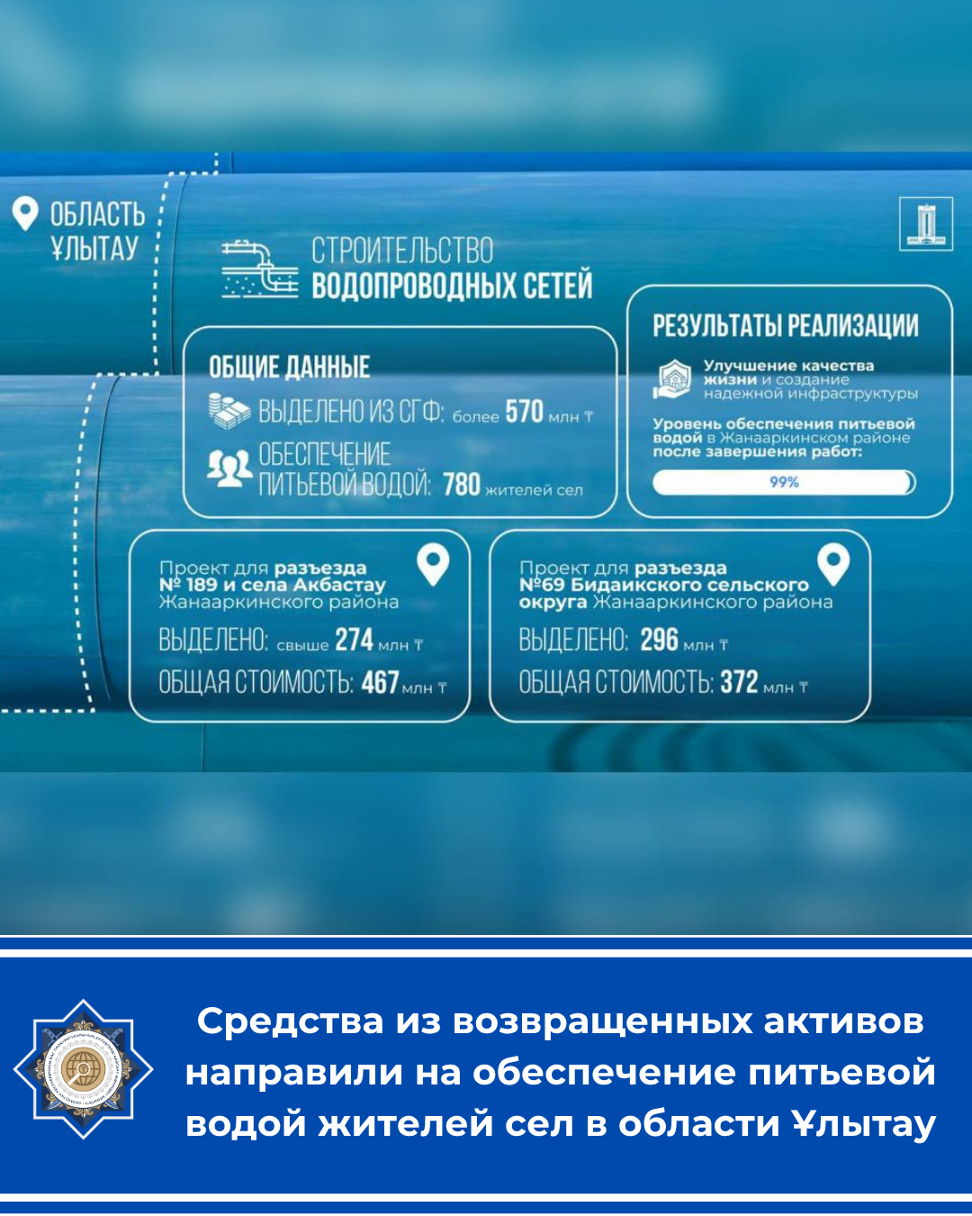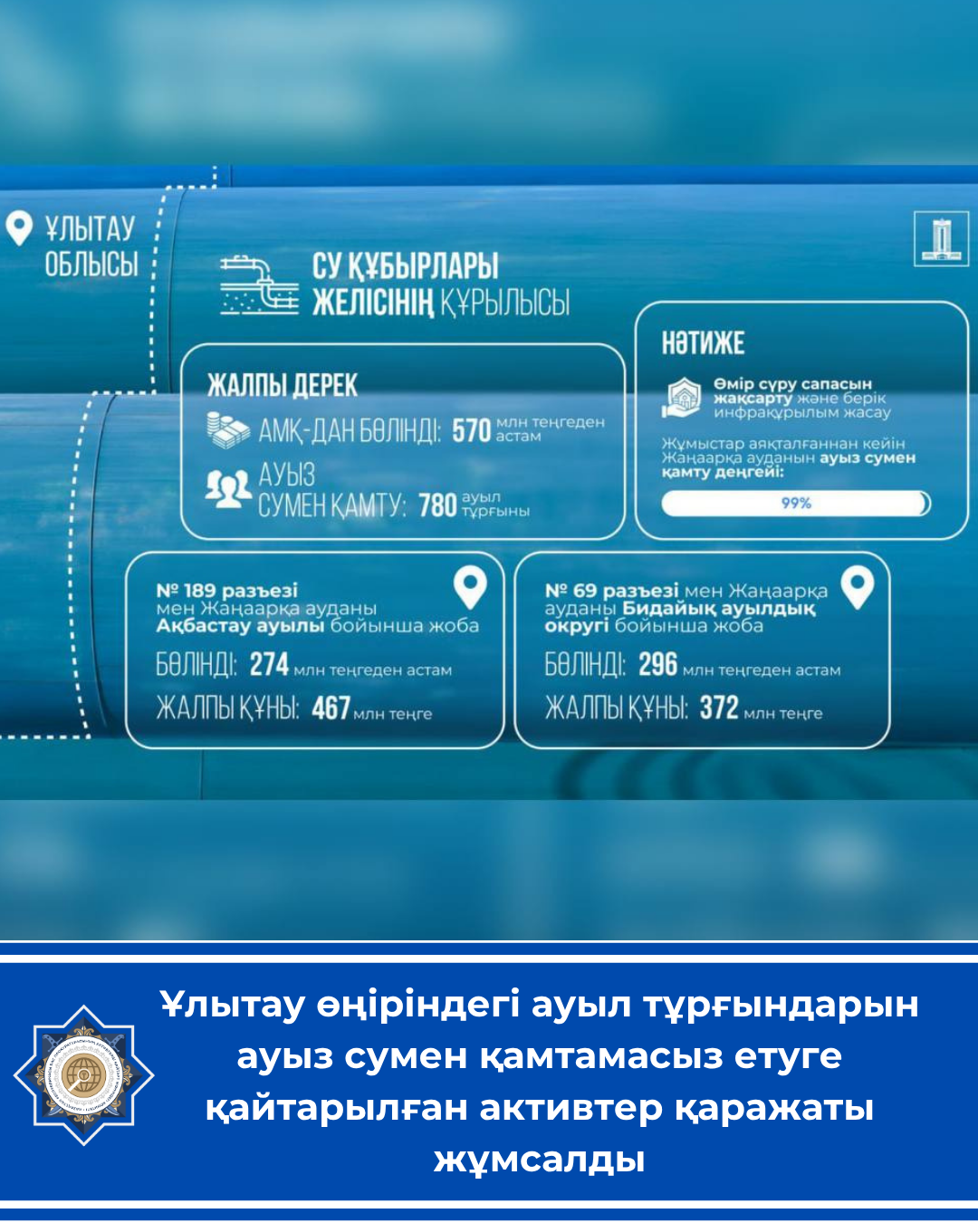 🔺Үкімет Ұлытау облысында су құбыры желілерін тартуға Арнаулы мемлекеттік қордан 570 млн теңгеден астам қаржы бөлді.