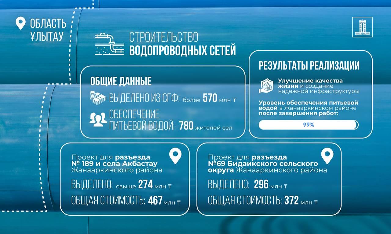 Үкімет Ұлытау облысында су құбыры желілерін тартуға Арнаулы мемлекеттік қордан 570 млн теңгеден астам қаржы бөлді.