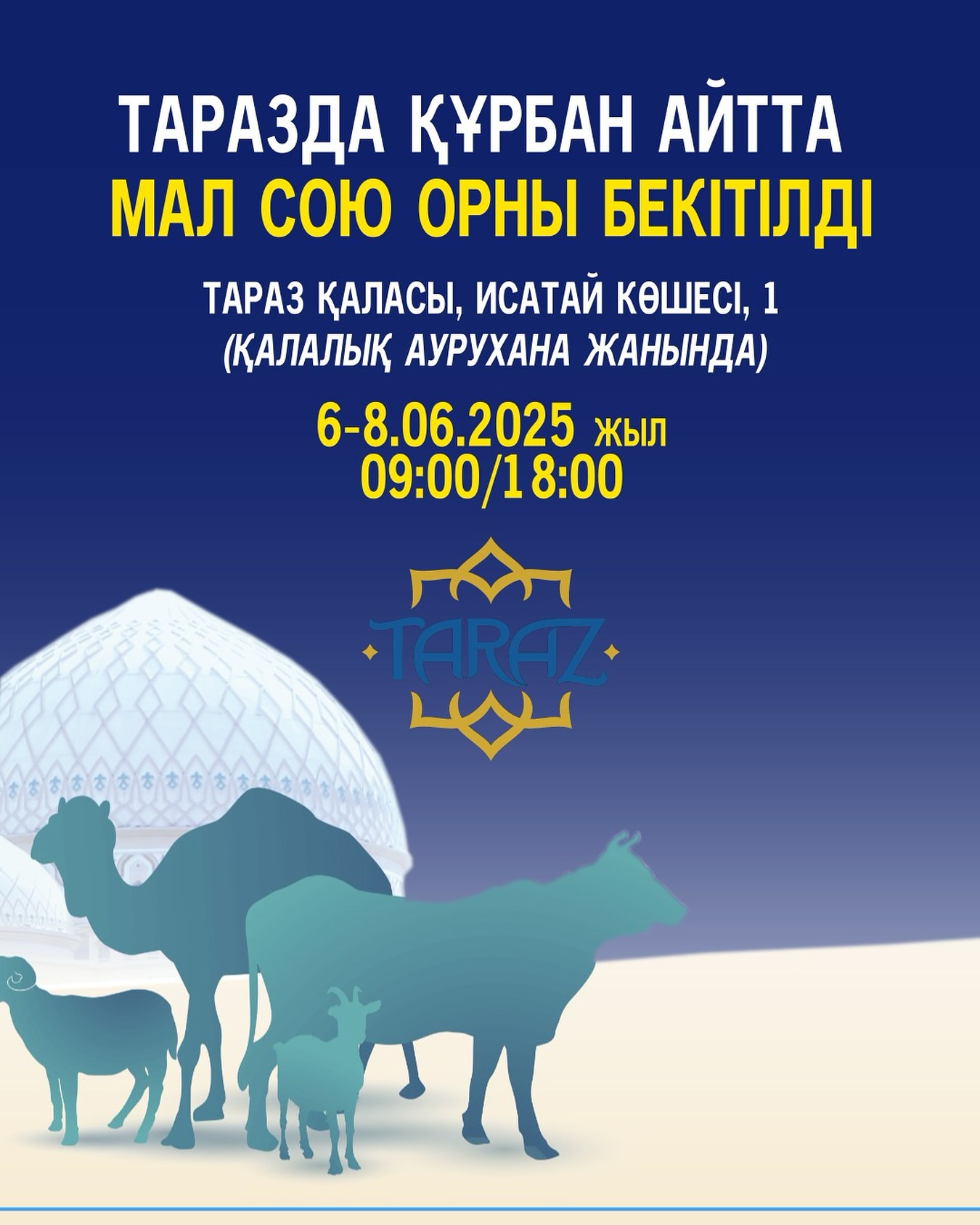 6-8 маусым аралығында мұсылмандар Құрбан айт мерекесін тойлайды. Осыған орай, Таразда мейрам кезінде мал сойылатын орын бекітілді.