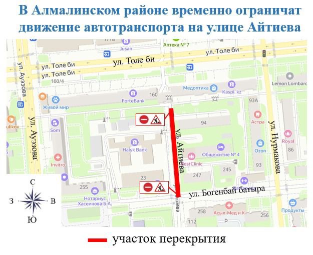 3 маусымнан бастап 6 шілдеге дейін Алматының Алмалы ауданында автокөліктер қозғалысы шектеледі: Әйтиев көшесімен Бөгенбай батыр көшесінен бастап Төле би көшесіне дейін (екі бағытта); Қазыбек би көшесімен Шөкин көшесінен бастап Исаев көшесіне дейін (екі бағытта).