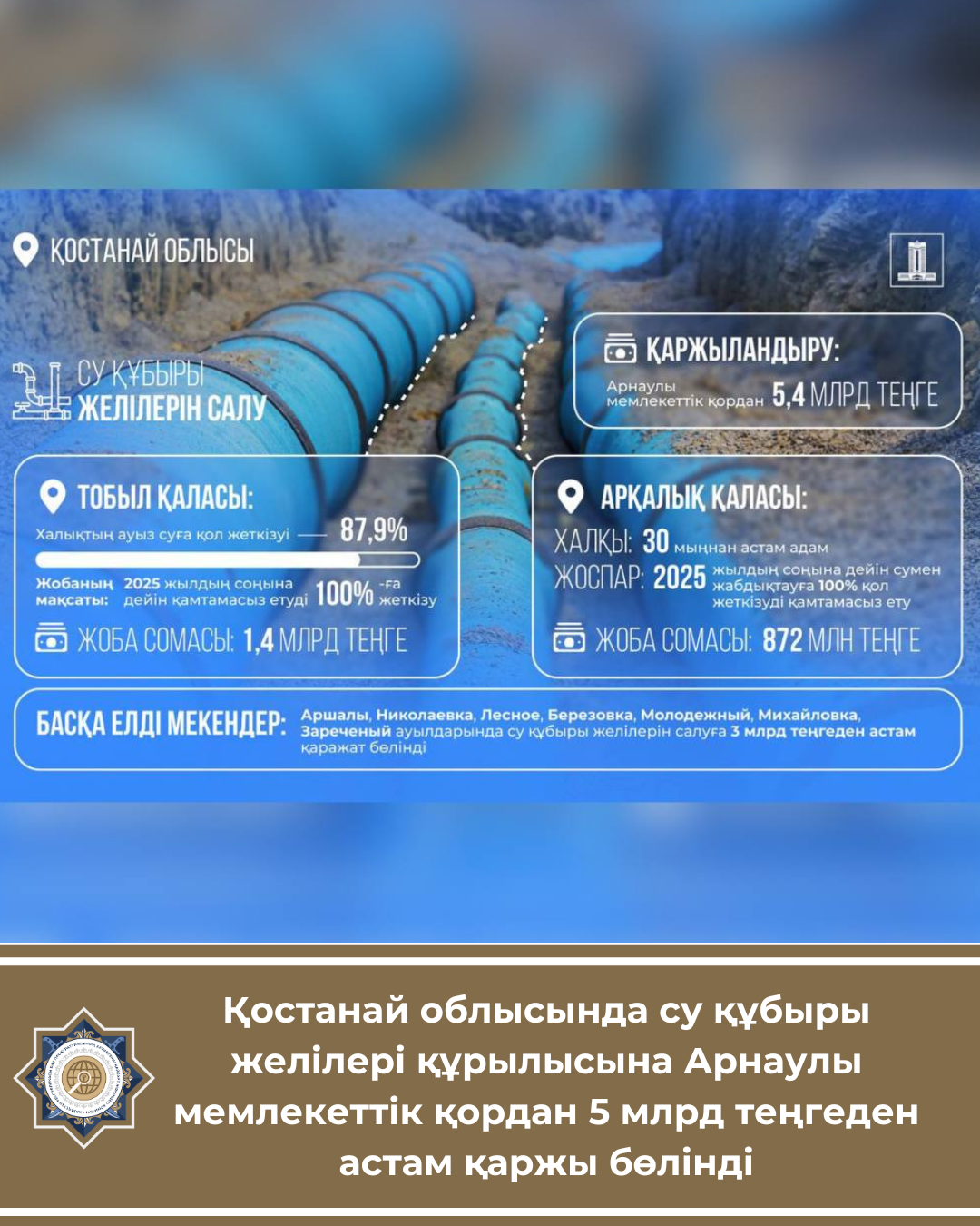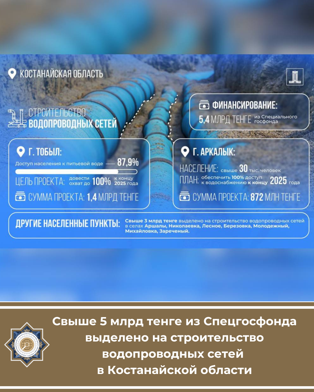 🔹Сонымен қатар Қарабалық, Денисов, Қостанай, Федоров, Бейімбет Майлин аудандары ауылдарында, сондай-ақ Арқалық қаласындағы Жастар ауылында жалпы құны 3 млрд теңгеден асатын су құбыры желілерін тарту жоспарланып отыр.