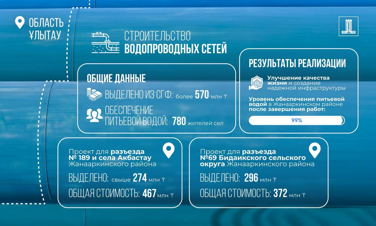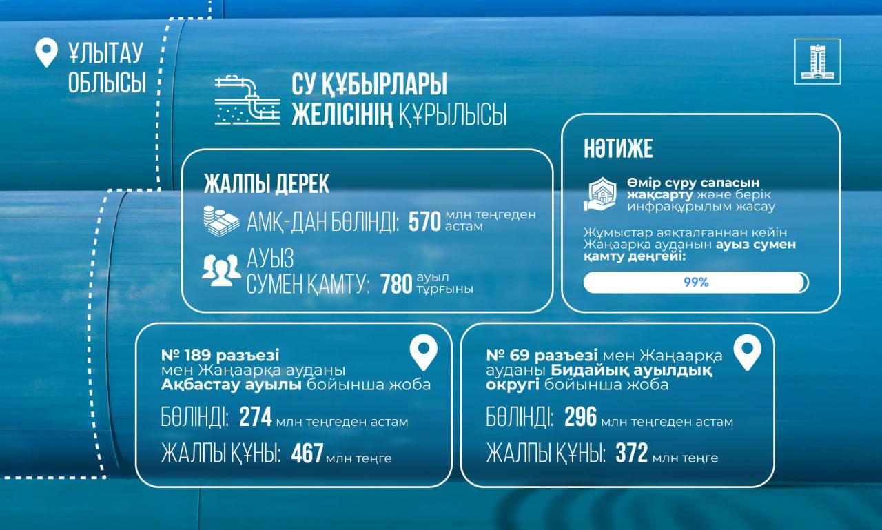 Үкімет Ұлытау облысында су құбыры желілерін тартуға Арнаулы мемлекеттік қордан 570 млн теңгеден астам қаржы бөлді.