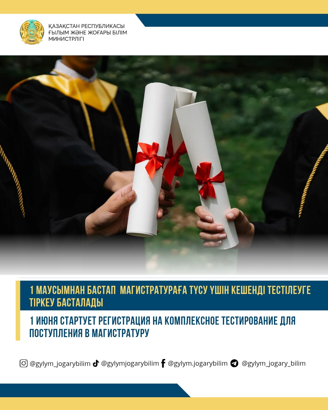 1 маусымнан бастап магистратураға түсу үшін кешенді тестілеуге қатысу үшін өтініштерді қабылдау басталады. Тіркелу ҚР ҒЖБМ Ұлттық тестілеу орталығының app.testcenter.kz сайтында 2025 жылғы 8 шілдеге дейін жүргізіледі. Тестілеудің өзі 20 шілде мен 10 тамыз аралығында өтеді.
