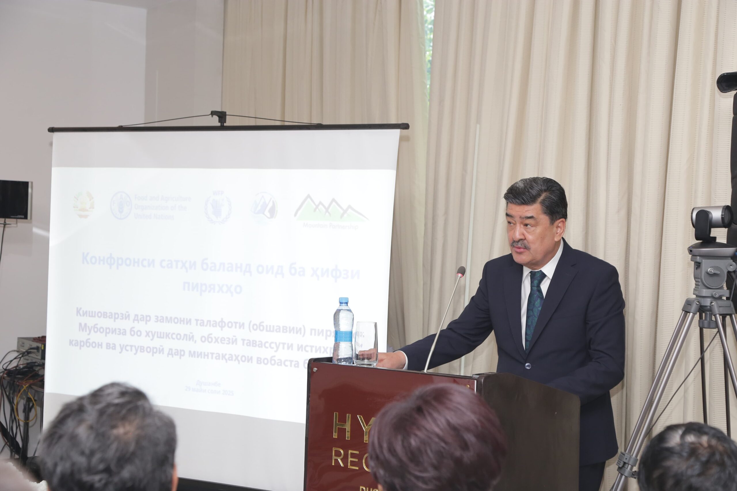 Душанбедегі Hyatt Regency қонақүйінде өткен жоғары деңгейдегі конференцияны БҰҰ Азық-түлік және ауыл шаруашылығы ұйымы (ФАО) мен Дүниежүзілік азық-түлік бағдарламасы (ВПП) ұйымдастырды. Іс-шара «Мұздықтардың еру дәуіріндегі ауыл шаруашылығы: құрғақшылықтар, су тасқындары және мұздықтарға тәуелді аймақтардағы тұрақтылық» тақырыбына арналды.