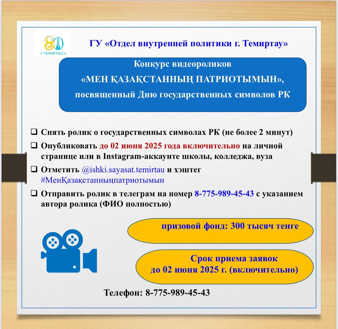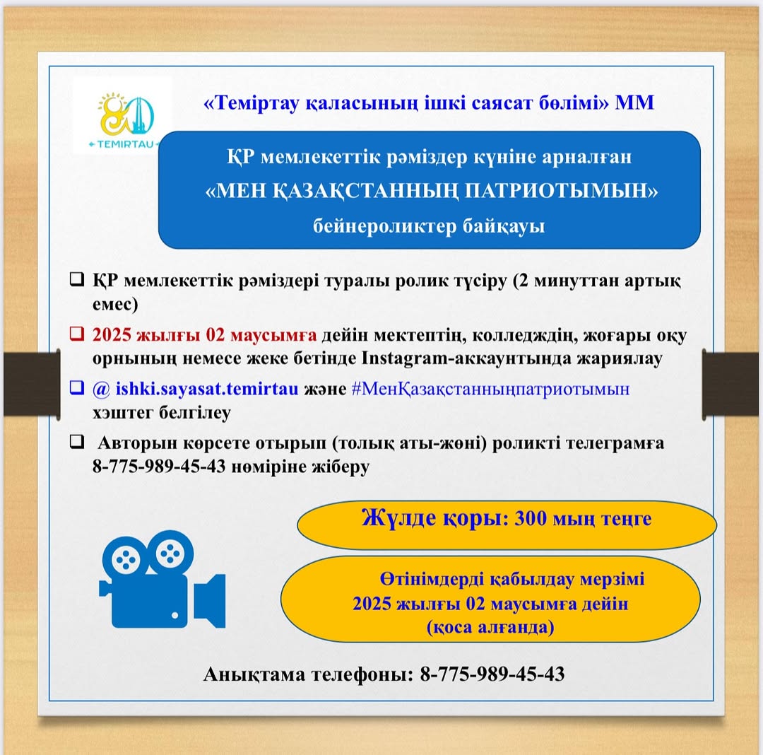 «Теміртау қаласының ішкі саясат бөлімі» ММ Қазақстан Республикасының Мемлекеттік рәміздер күніне арналған «Мен Қазақстанның патриотымын» бейнероликтер байқауының басталуын хабарлайды.