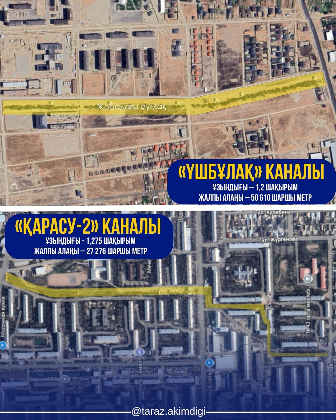 Енді алдағы уақытта «Үшбұлақ» және «Қарасу-2» каналдары да жаңғыртылатын болады. «Үшбұлақ» су арнасы бірінші кезеңде 1,2 шақырымы ал «Қарасу» каналының 1,275 шақырымы абаттандырылады.